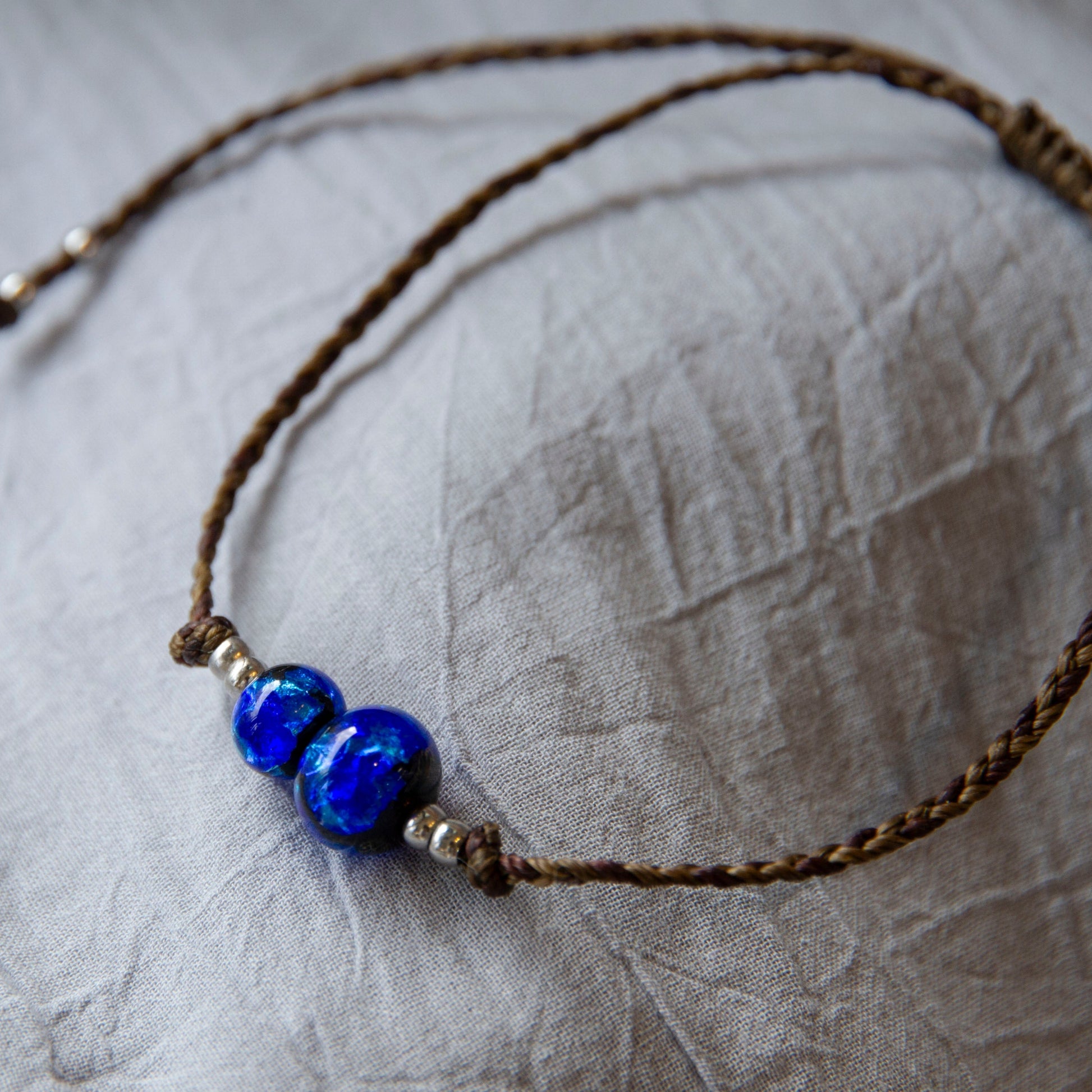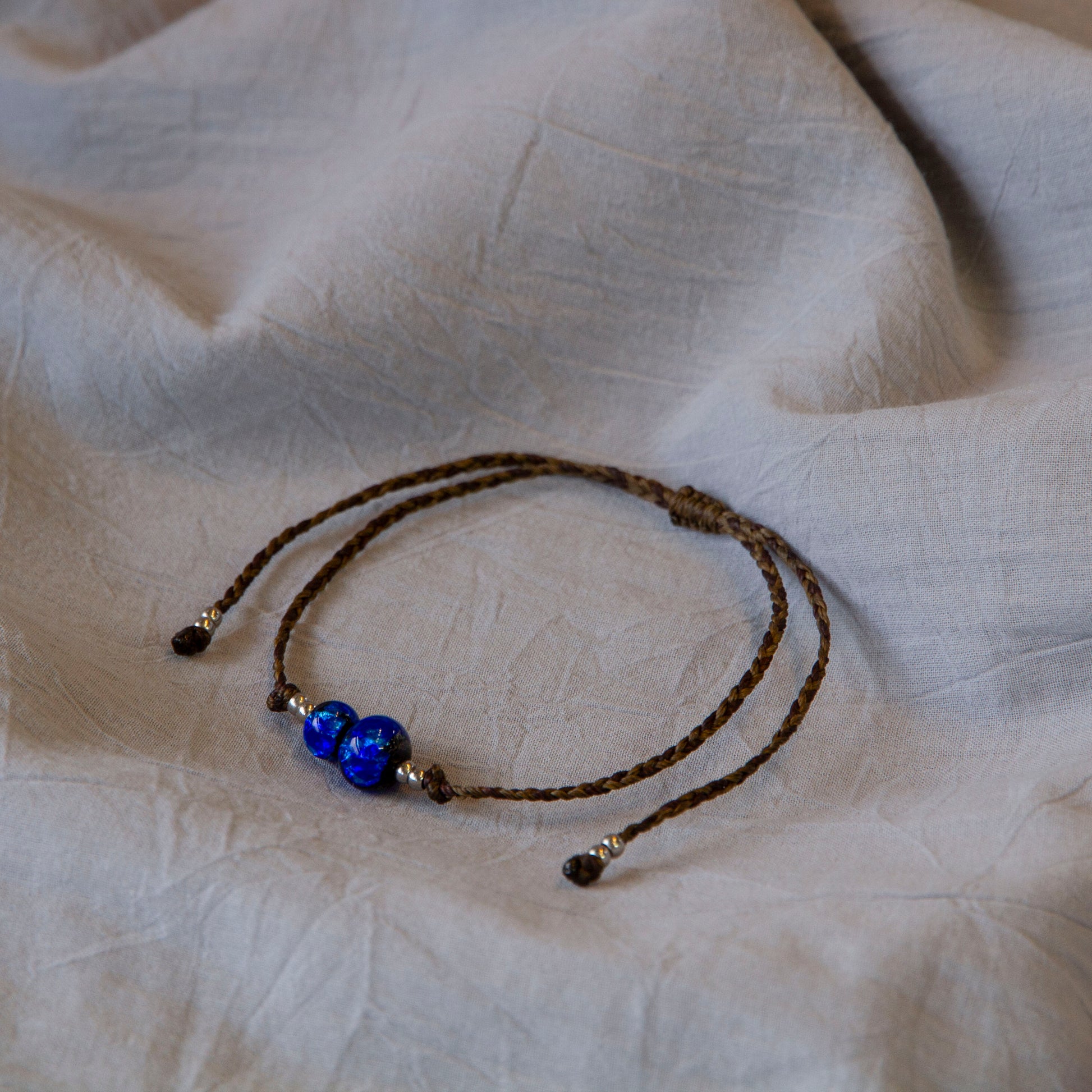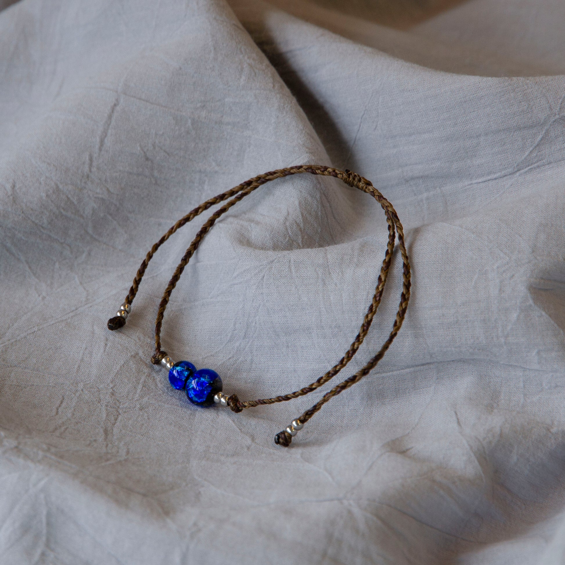蝋引き紐で編み上げたアンクレットは軽い着け心地で、紐を引くことで長さ調節も可能です。男女ともにおすすめです。