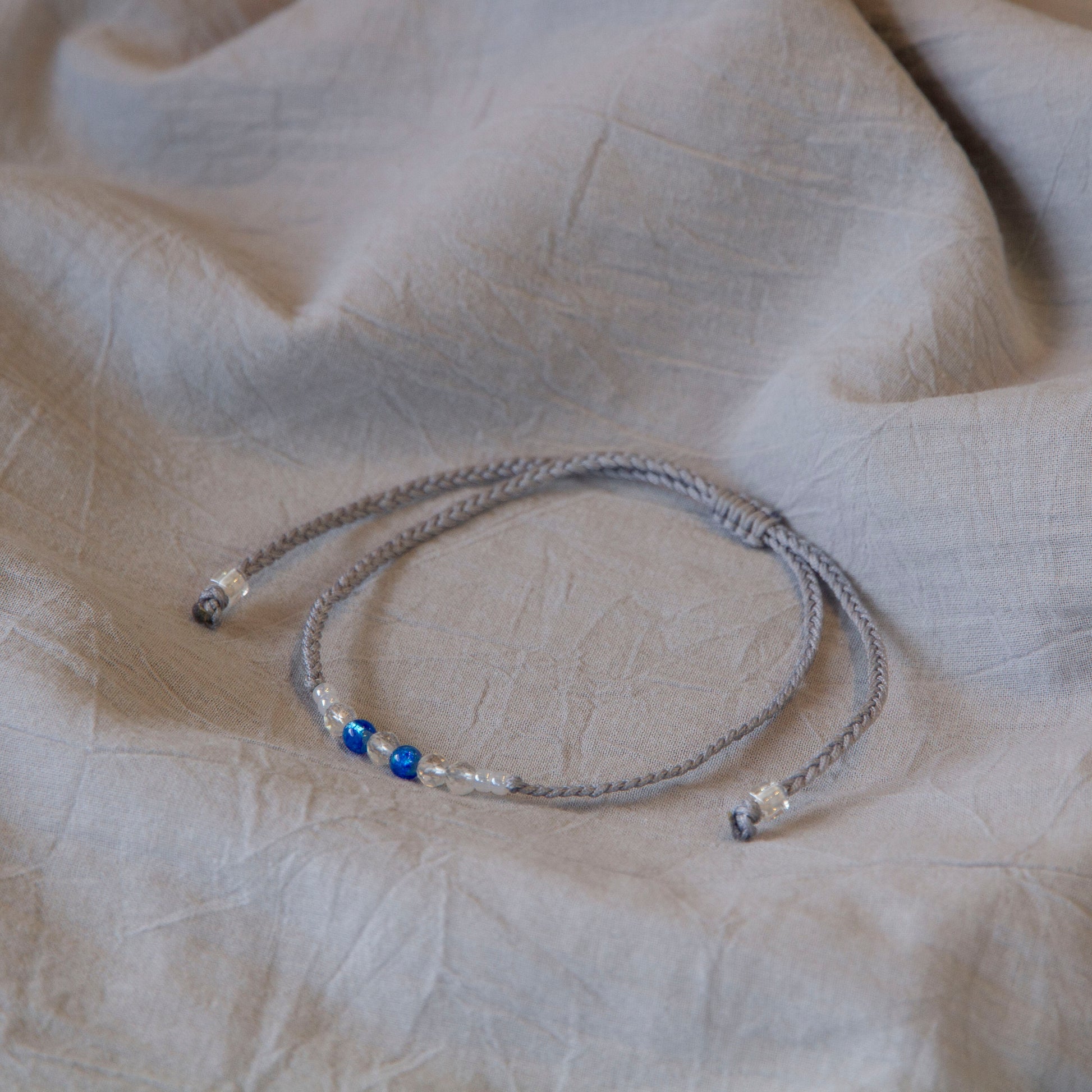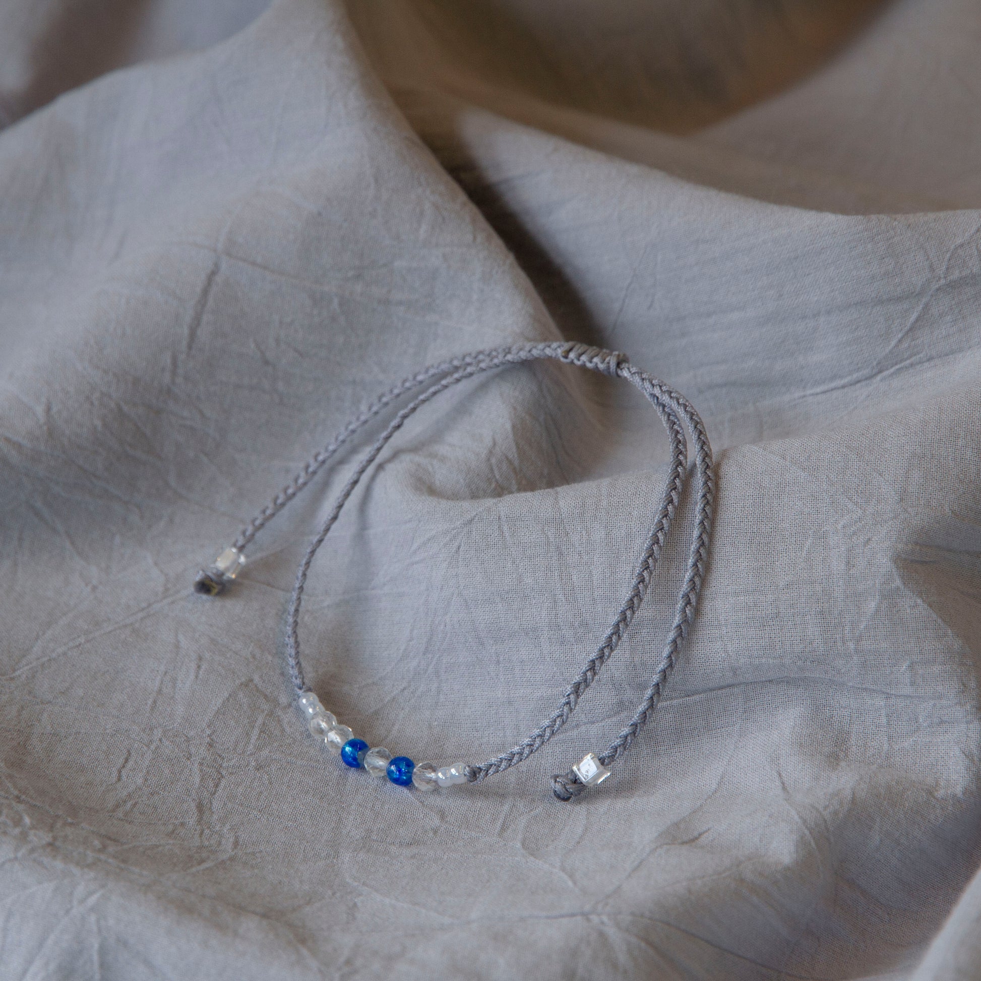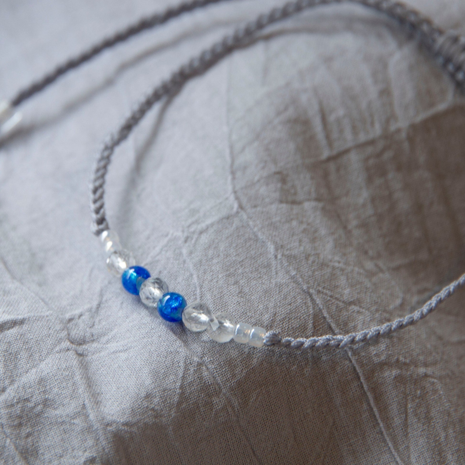 汗や水に強いナイロンコードと天然石を使用したホタルガラスアンクレット。入浴や海水浴でも着用OKなウォーターレジスタントアンクレットです。軽い着け心地でカジュアルに日常使いとしてスタイリングを楽しめます。紐を引くことで長さ調節も可能なので男女ともにおすすめです。