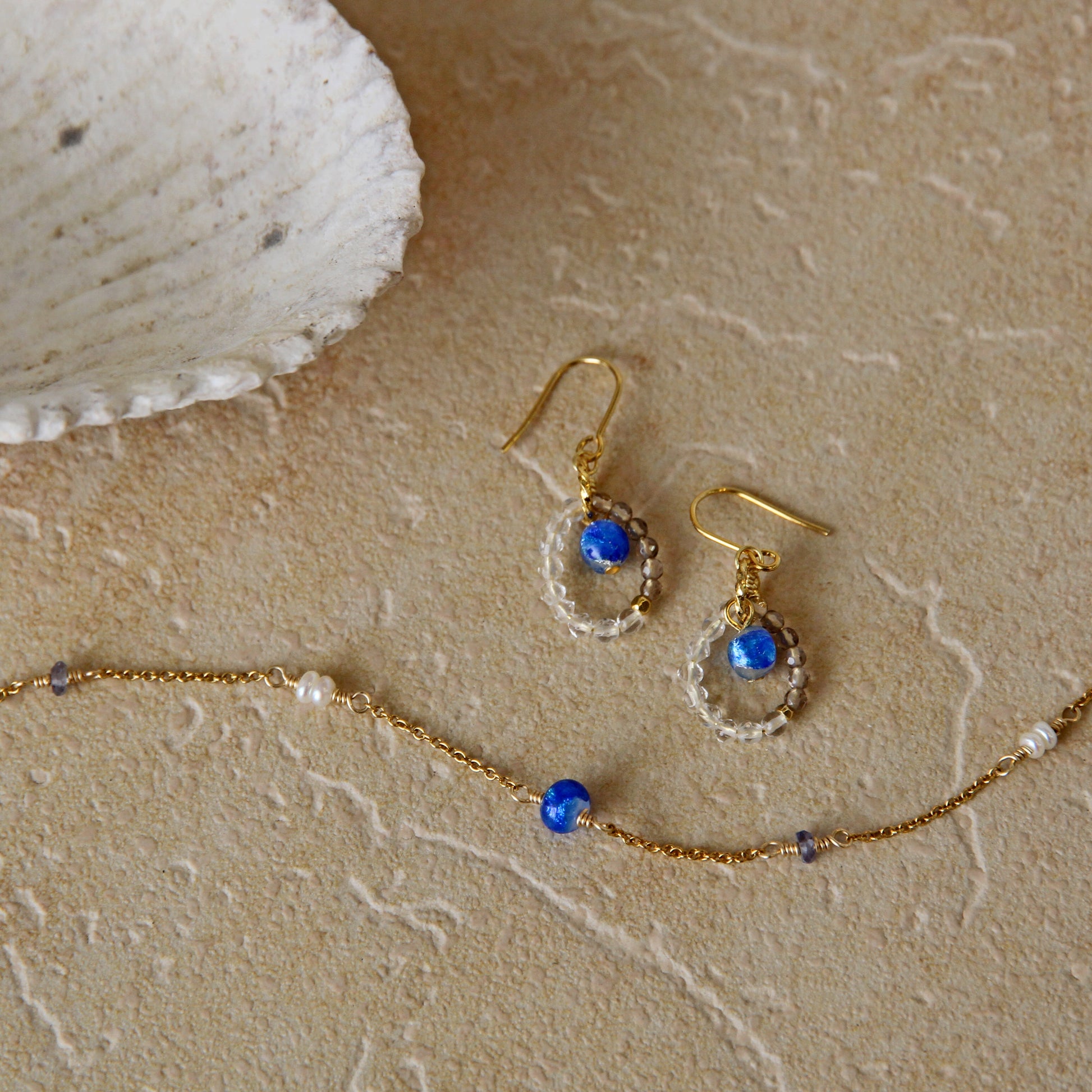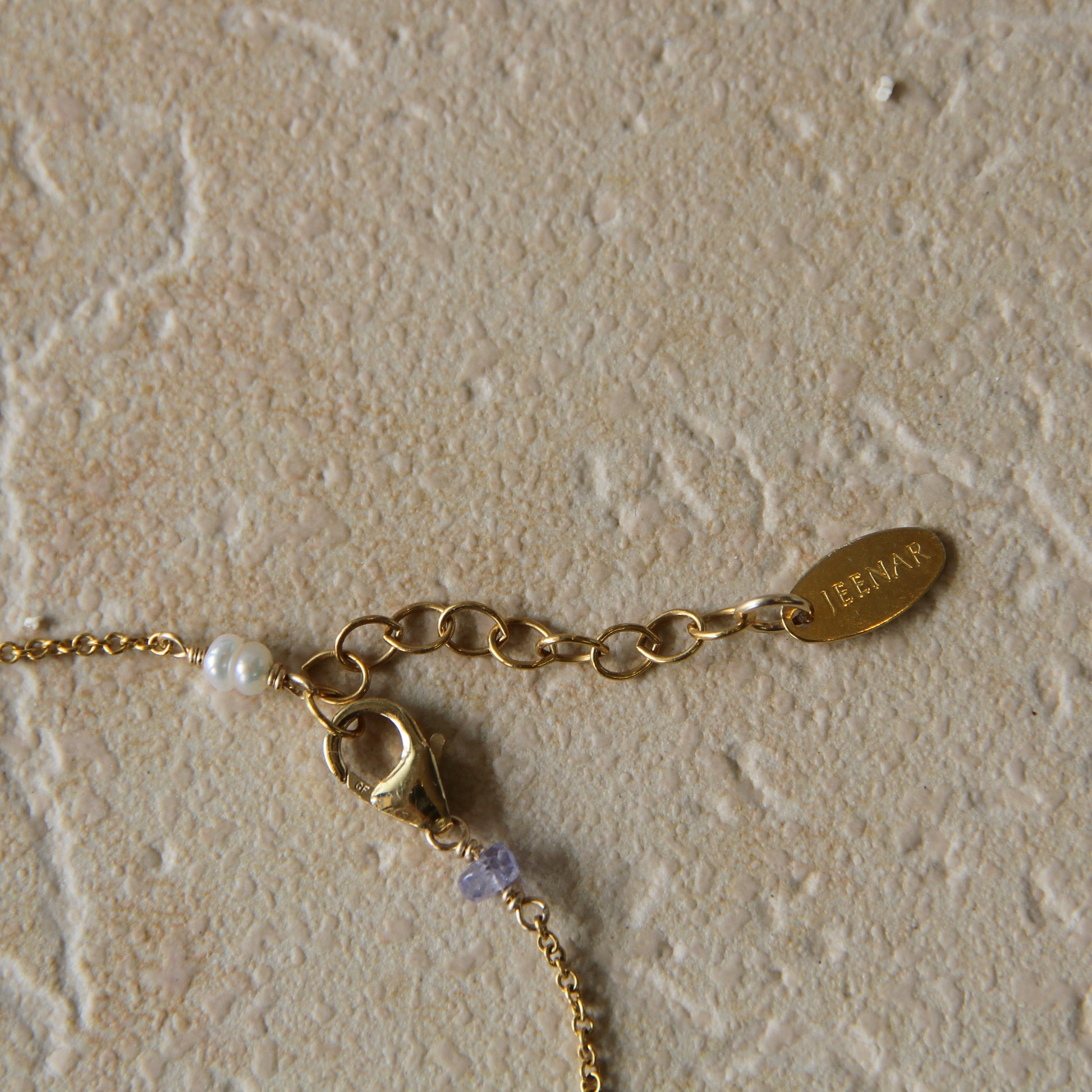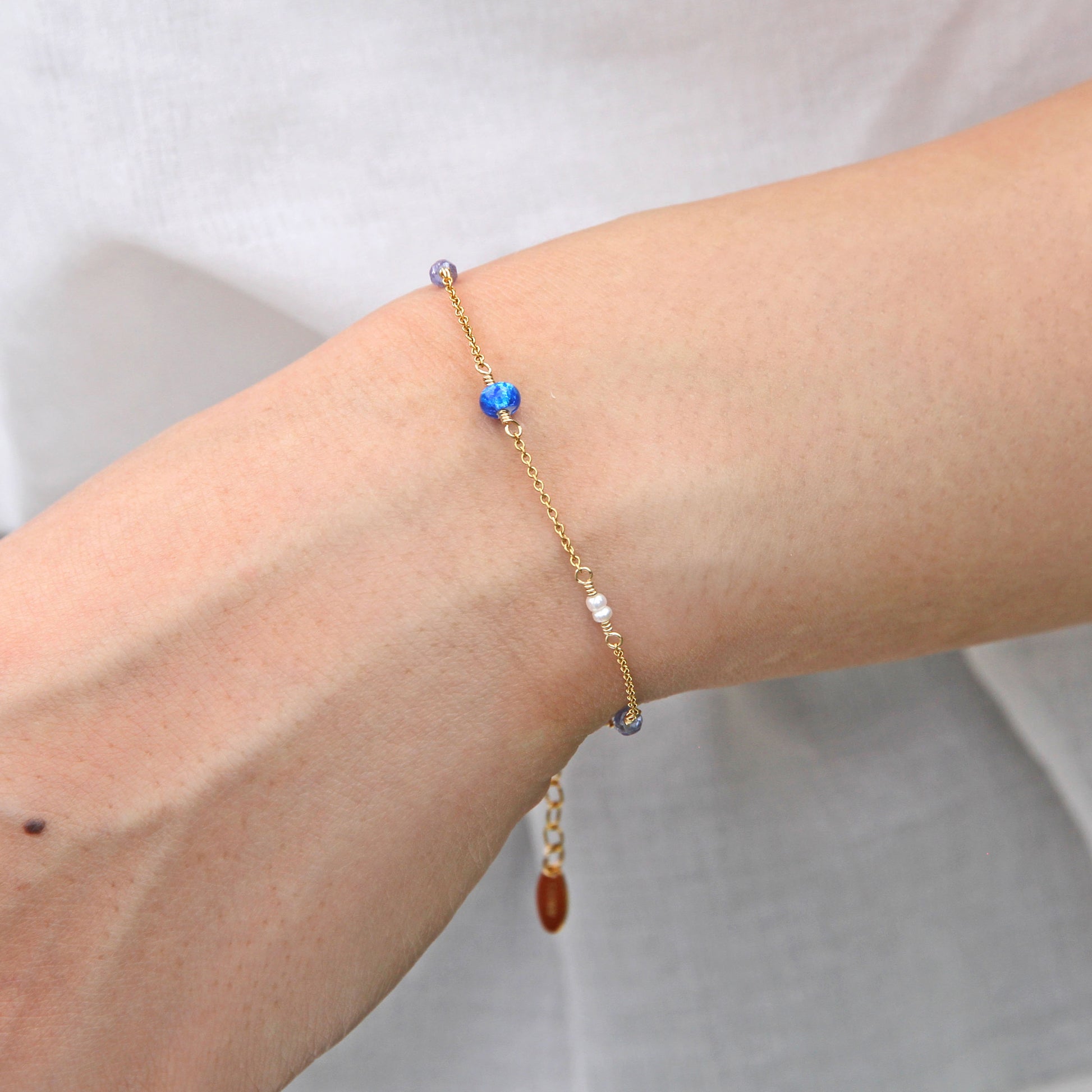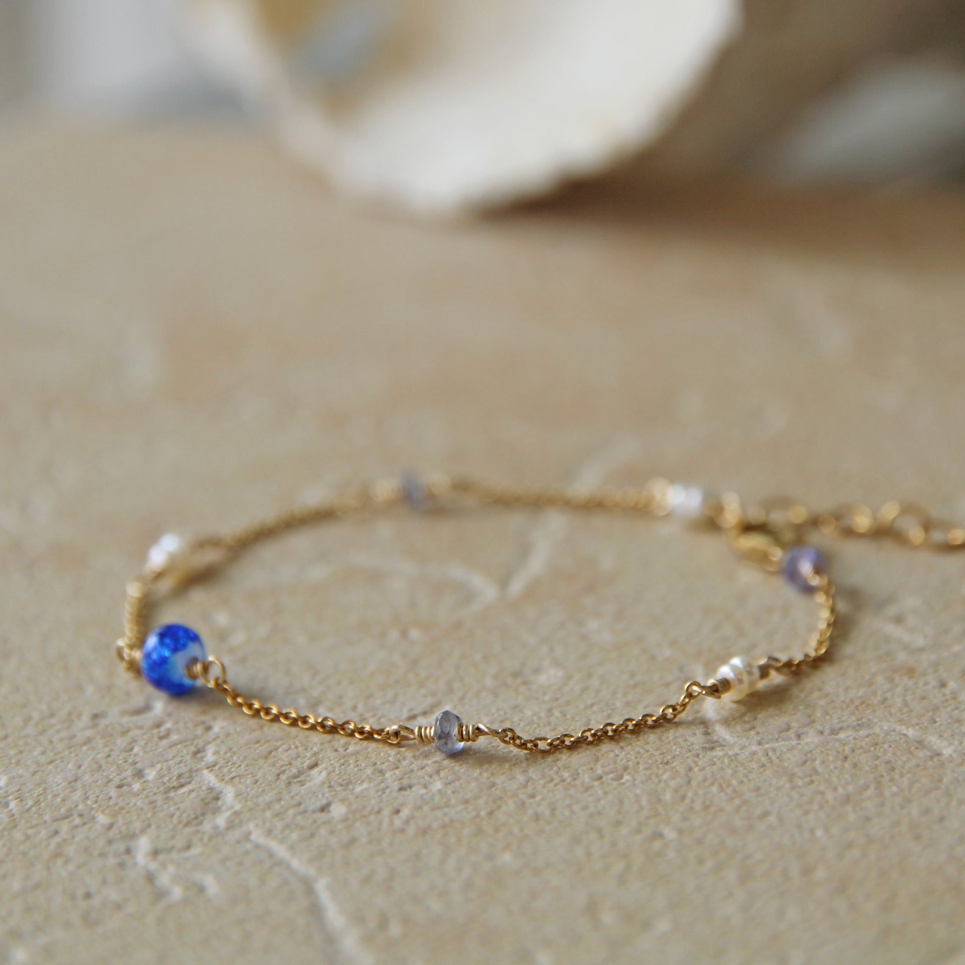 ホワイトホタルガラスとタンザナイト、淡水パールを使用した華奢なチェーンブレスレットです。