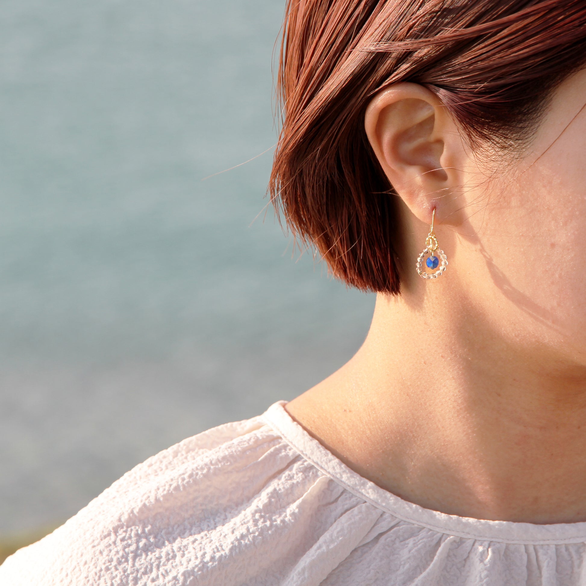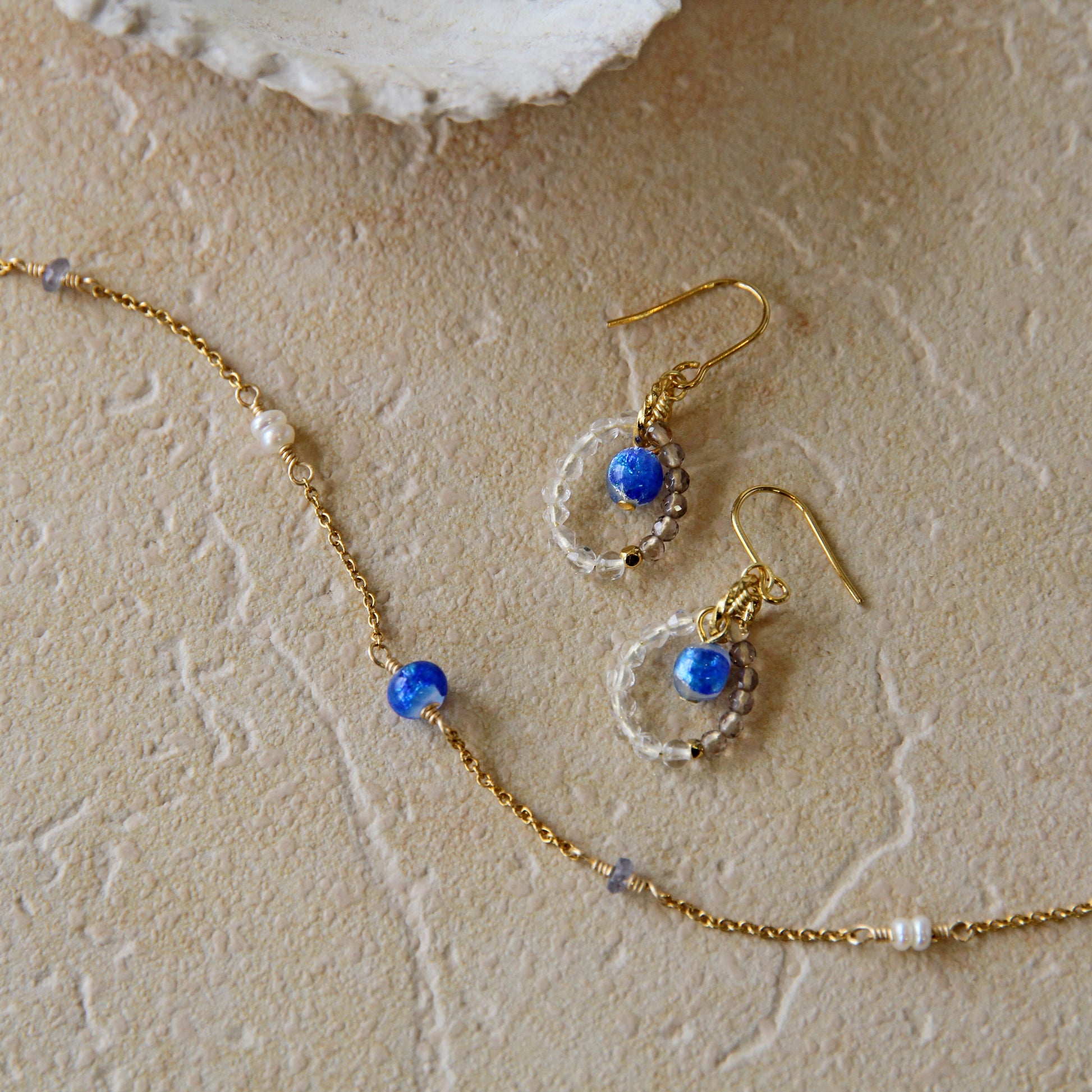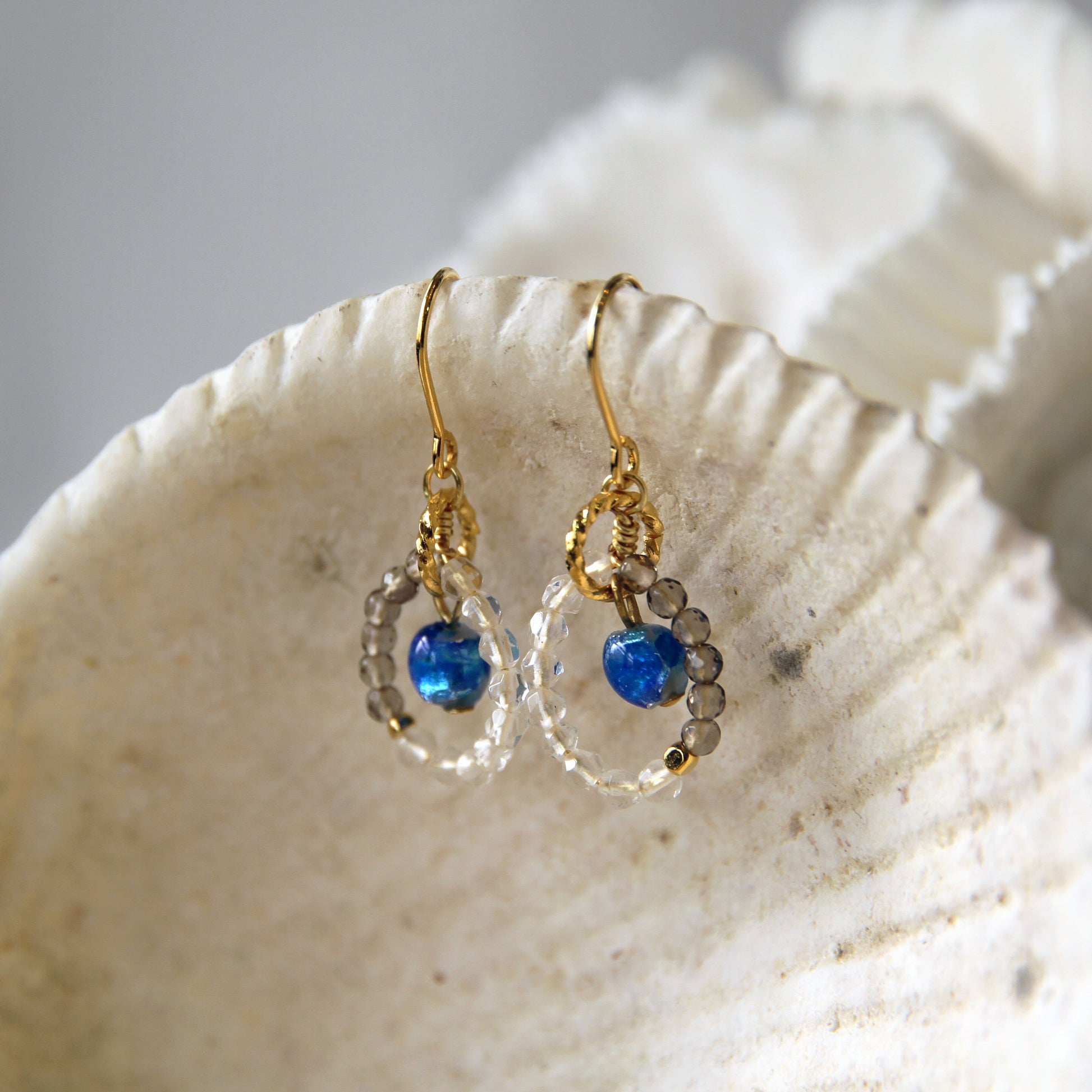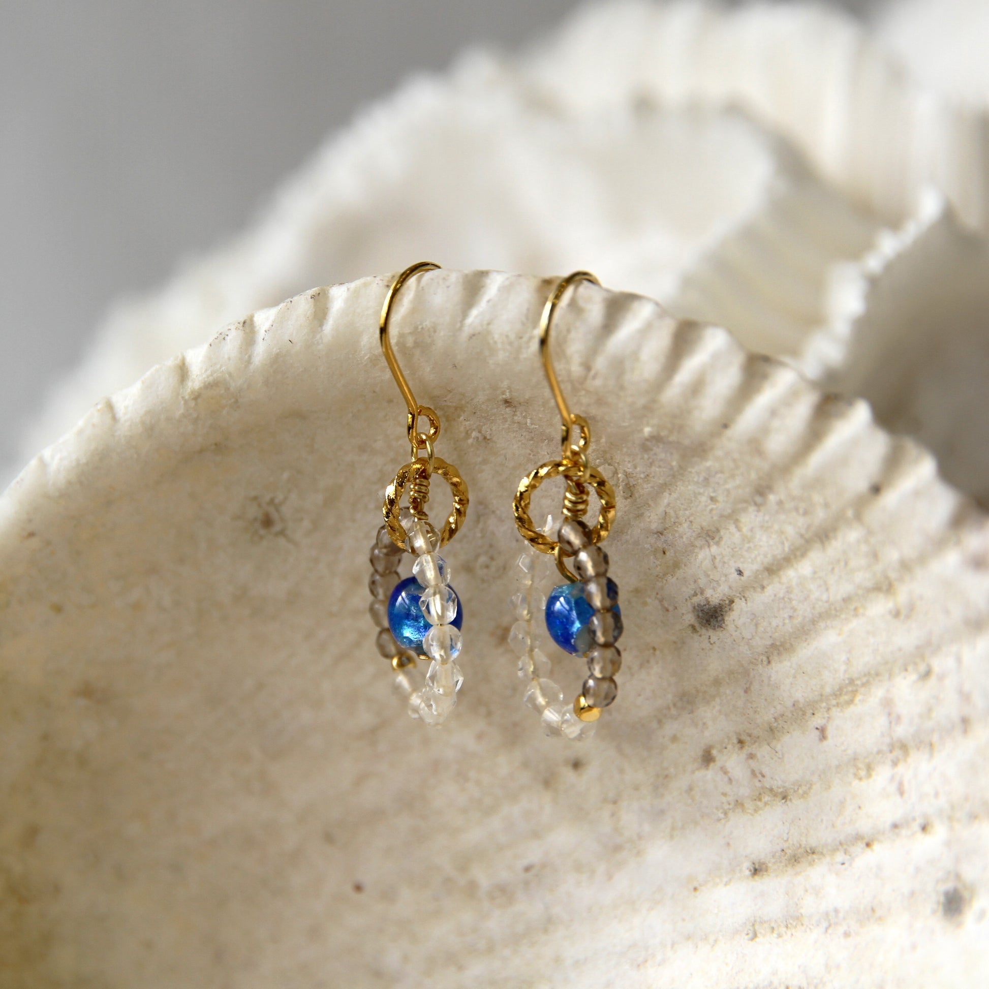 ホワイトホタルガラスに水晶とスモーキークォーツを合わせて透明感をプラスしたピアス。真ん中で揺れるホワイトホタルガラスが可愛く、小ぶりなデザインがコーデに合わせやすいアイテムとなっています。
