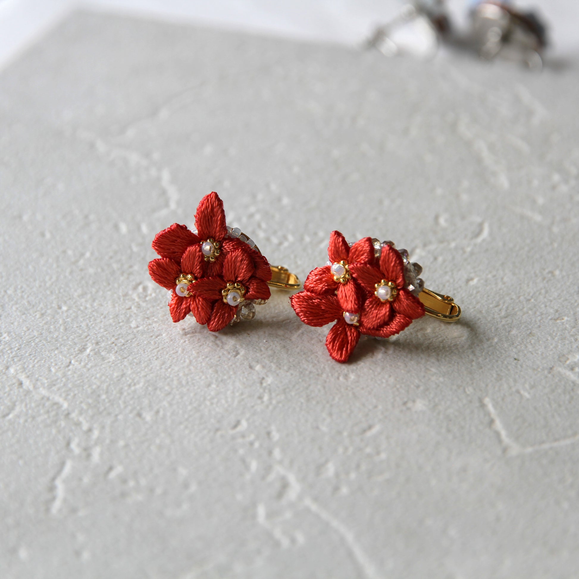 沖縄の風景に溶け込んだサンダンカを刺繍にしたイヤリングは、可愛いだけでなく気分も上げてくれるような彩り。