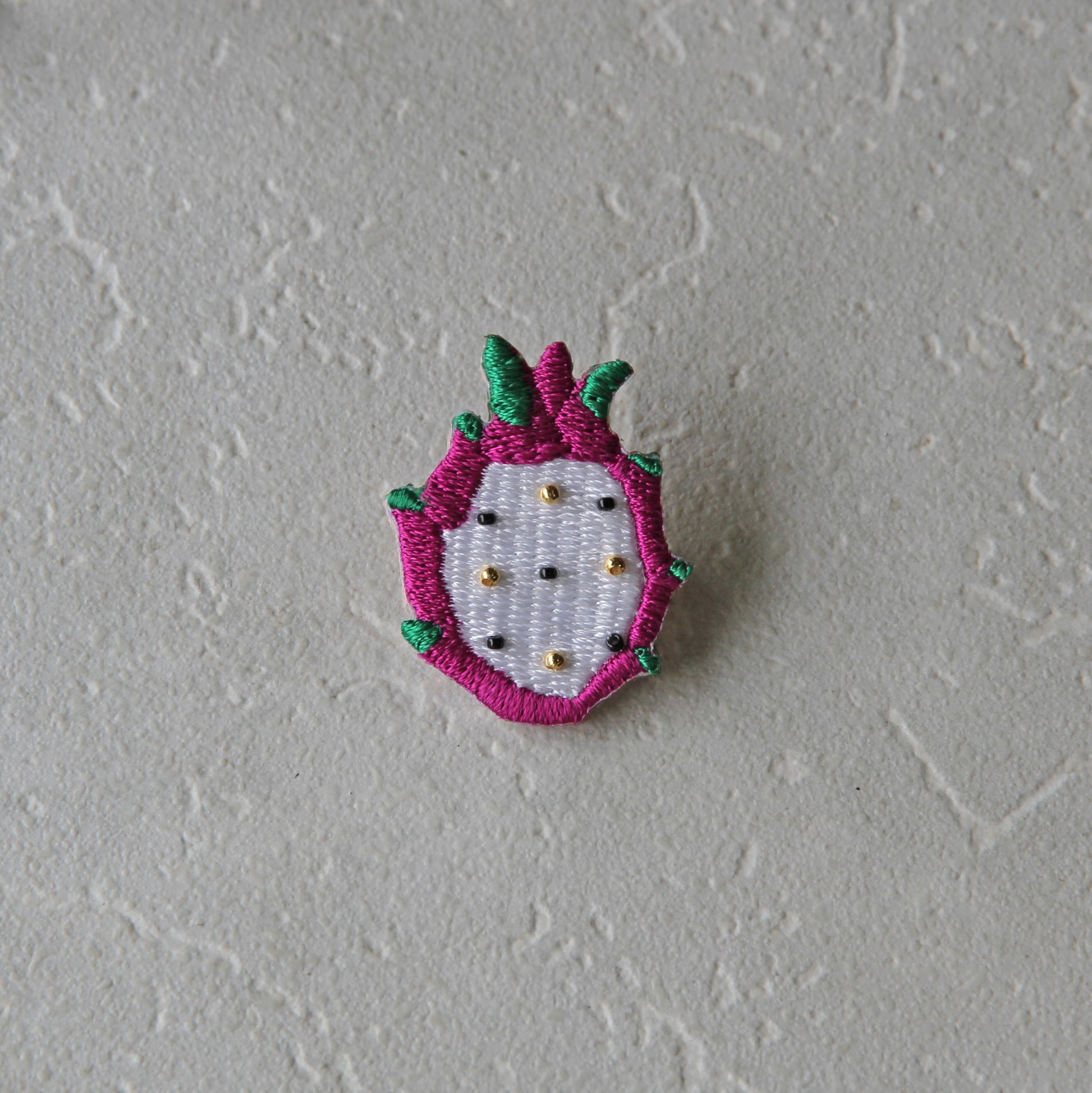 見た目インパクト大なドラゴンフルーツをブローチにしました。 ピンクと白のコントラストに つぶつぶ黒のビーズとゴールドで可愛らしく仕上げました。 ドラゴンフルーツの花言葉は「燃える心」