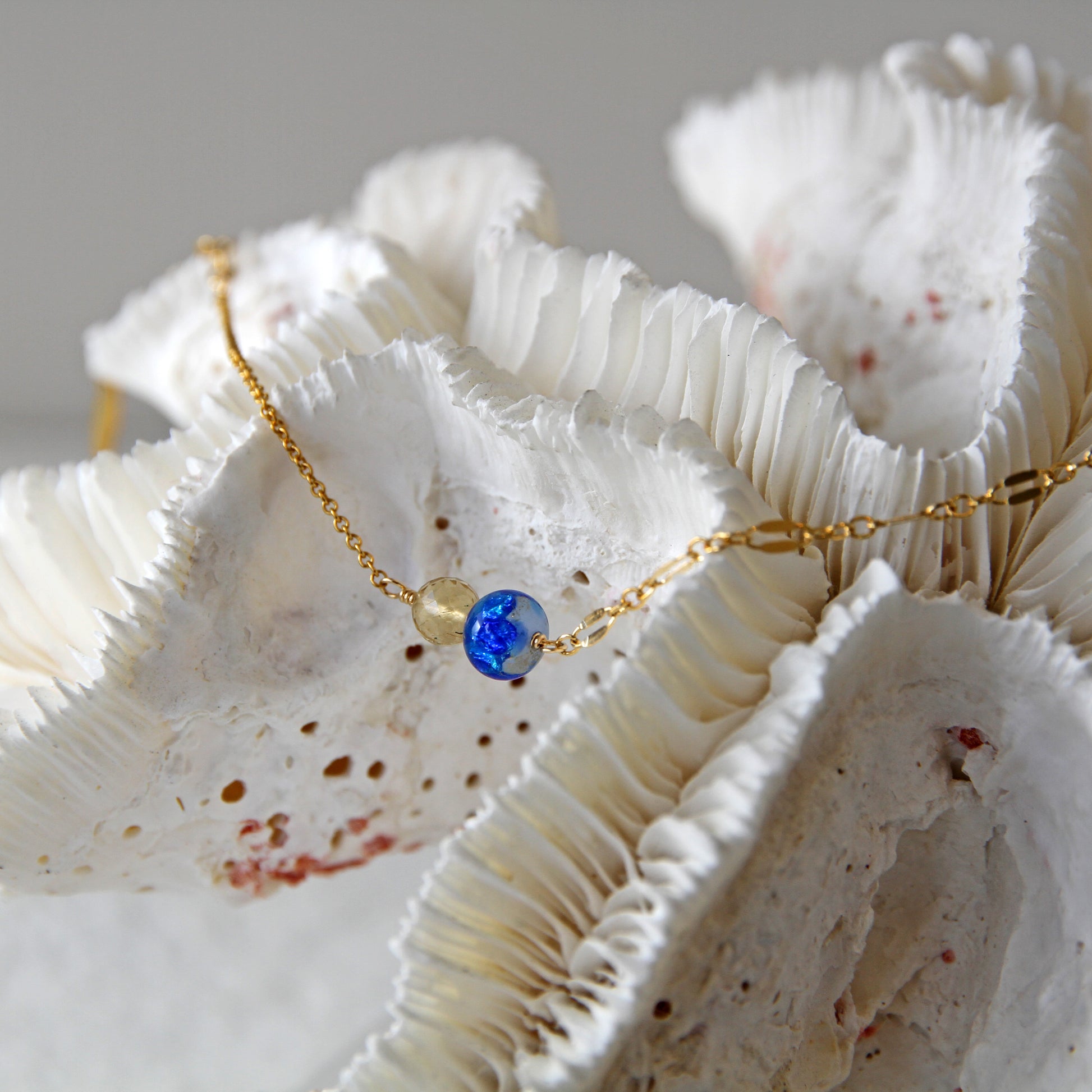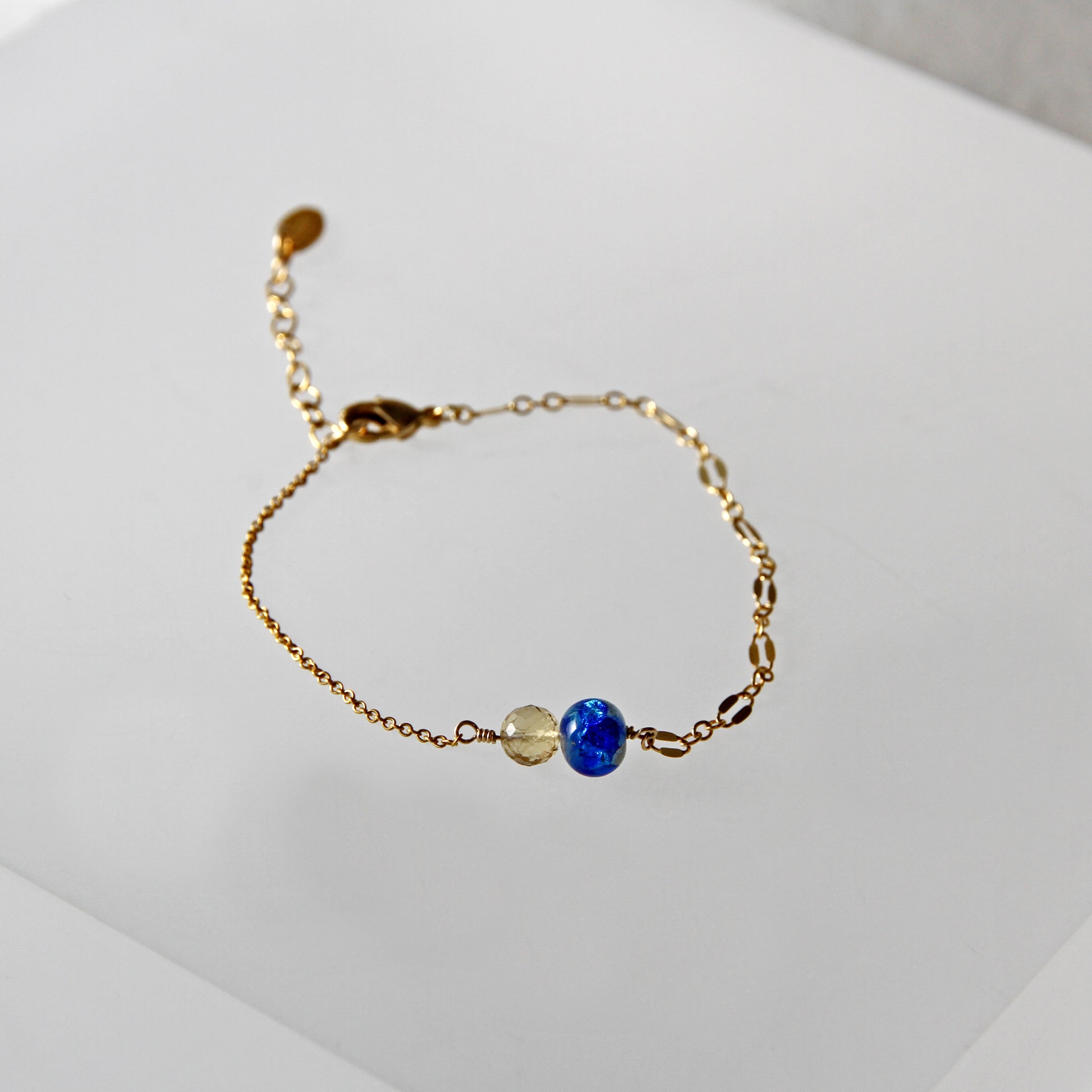 ホワイトホタルガラスにカット加工が施されているシトリンを組み合わせることで、動くたびに手元をキラキラ輝かせてくれます。華奢なチェーンとデザインチェーンでアシンメトリーに仕上げ手元に抜け感を演出。
