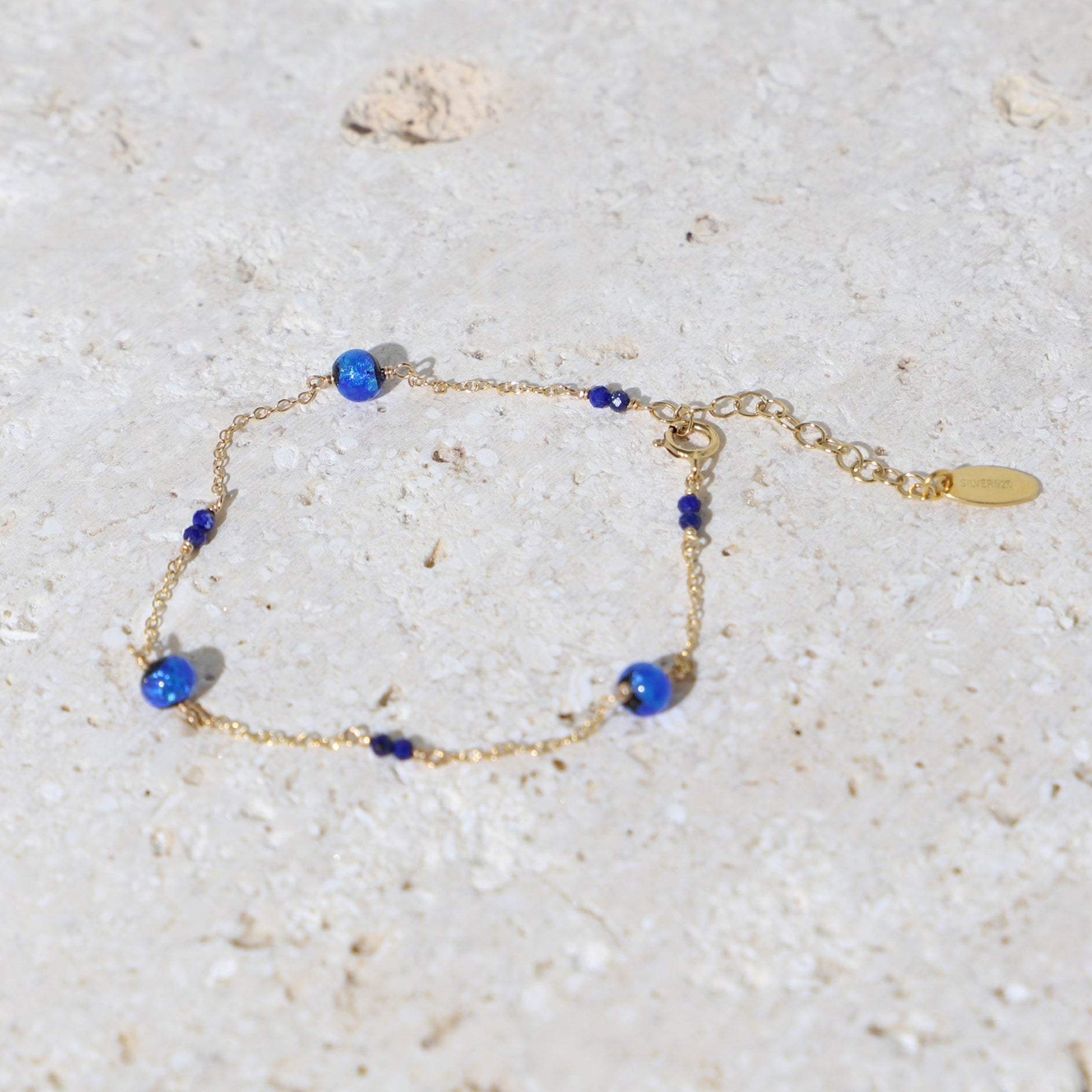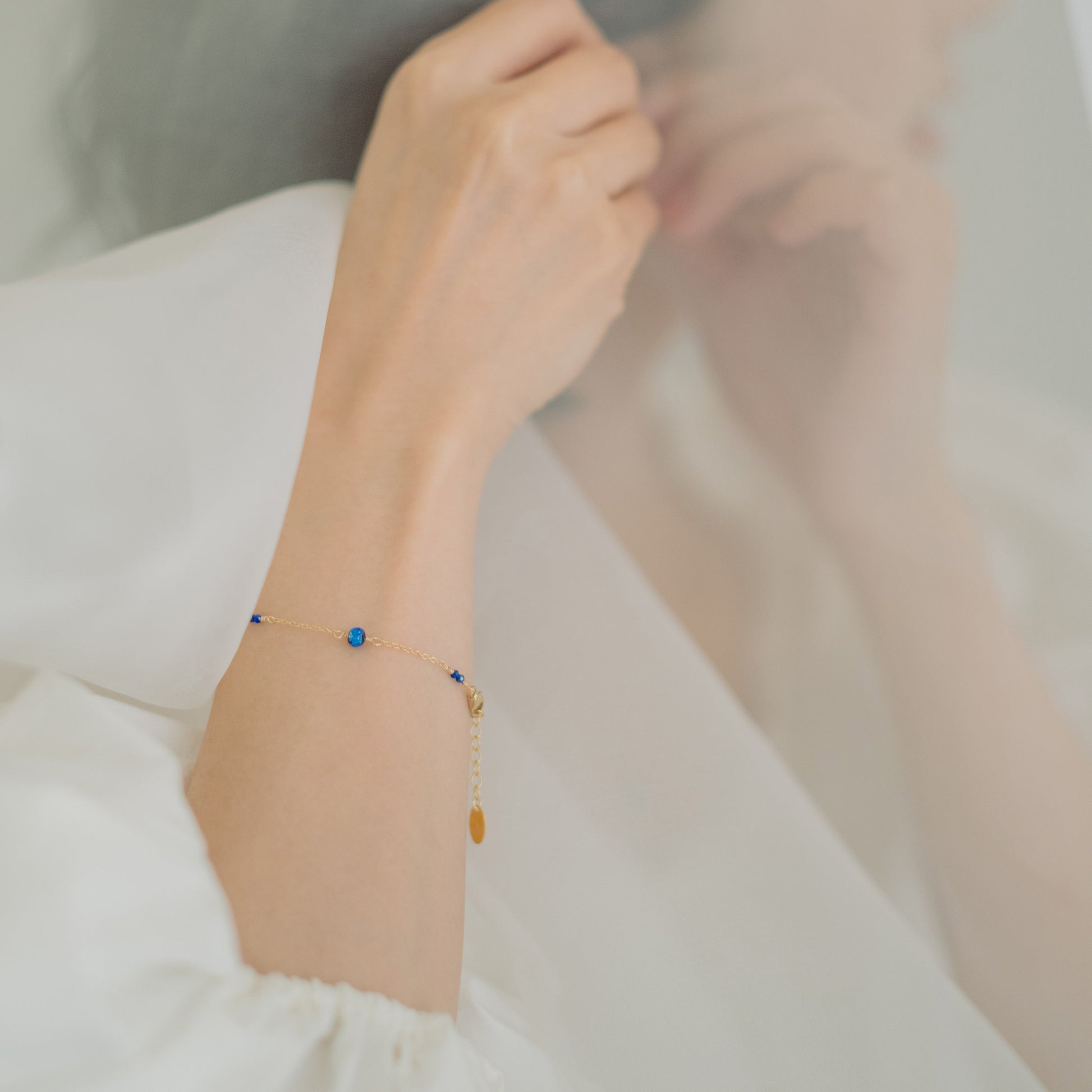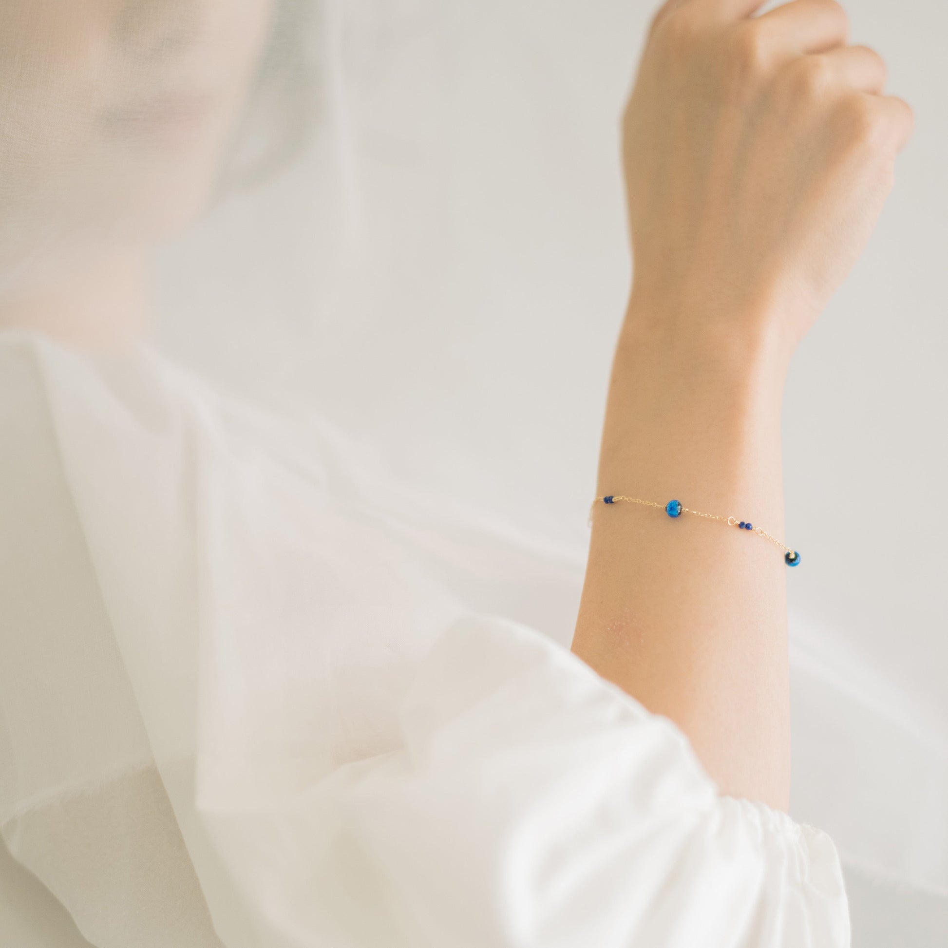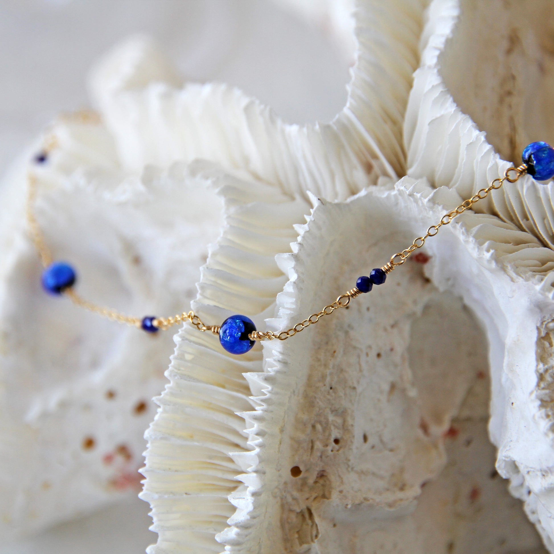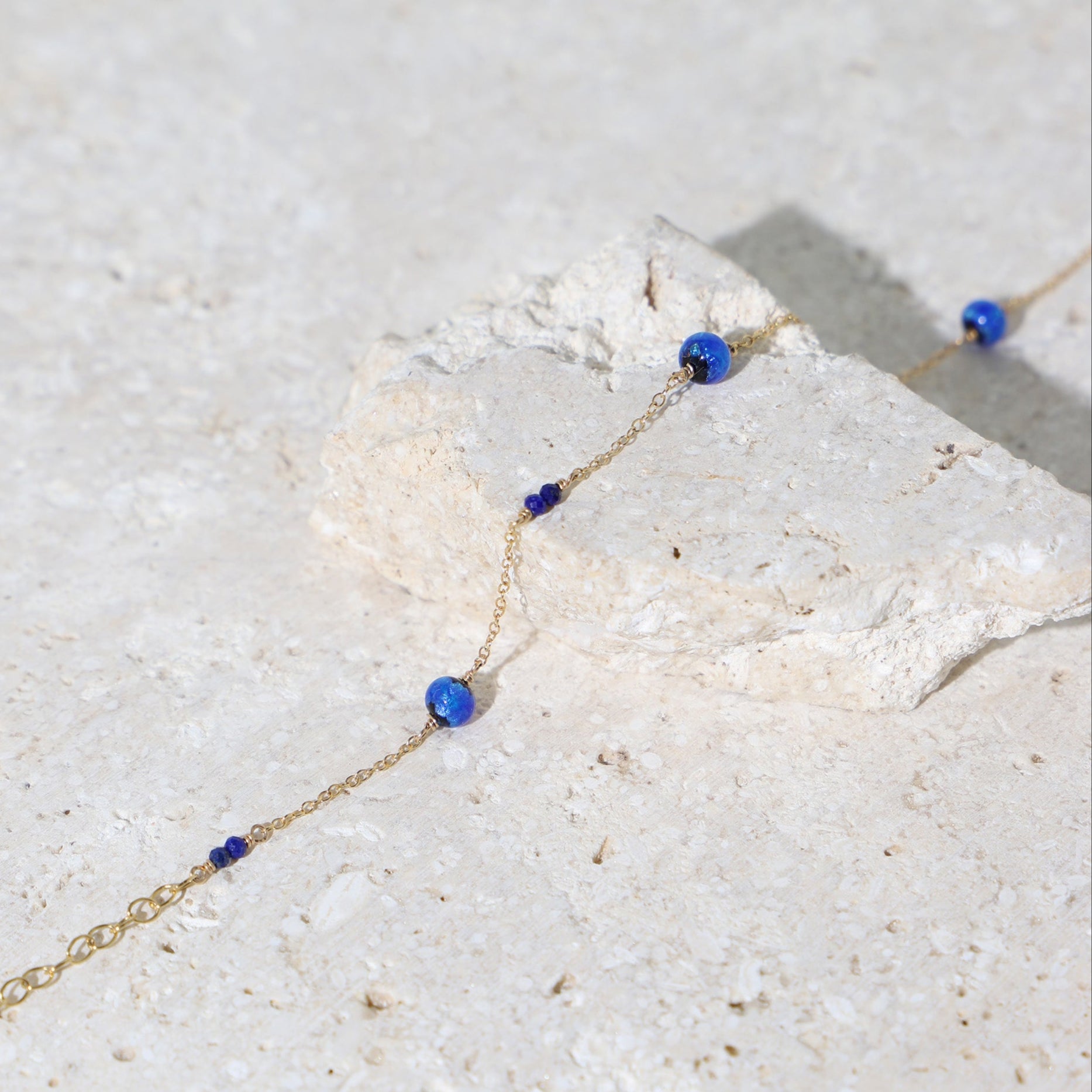 ホタルガラスとラピスラズリという、異なる素材のブルーが溶け合ったデザイン。