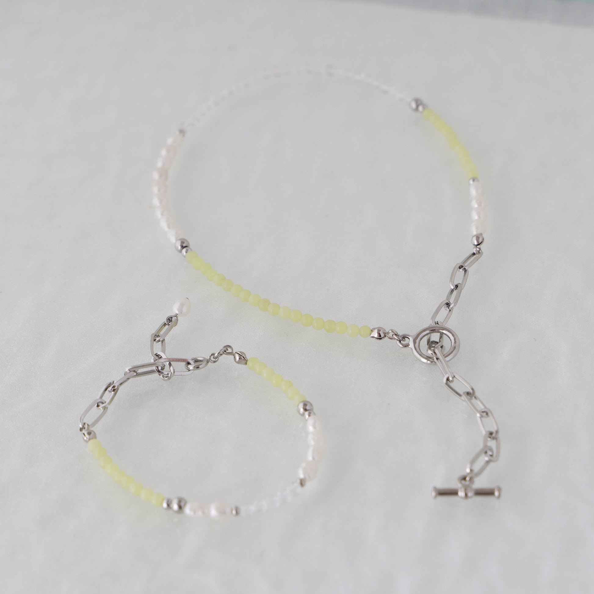 yellow:オリーブジェイド、淡水パール、水晶、真鍮ロジウムメッキパーツ