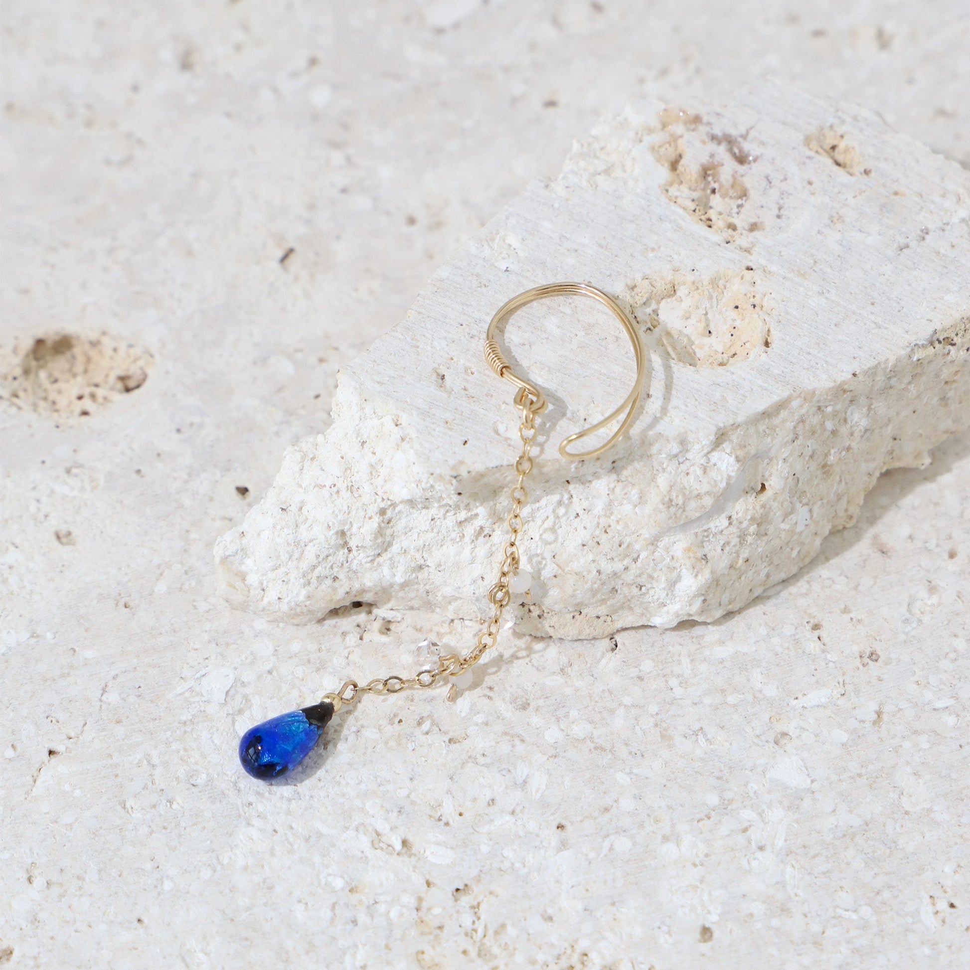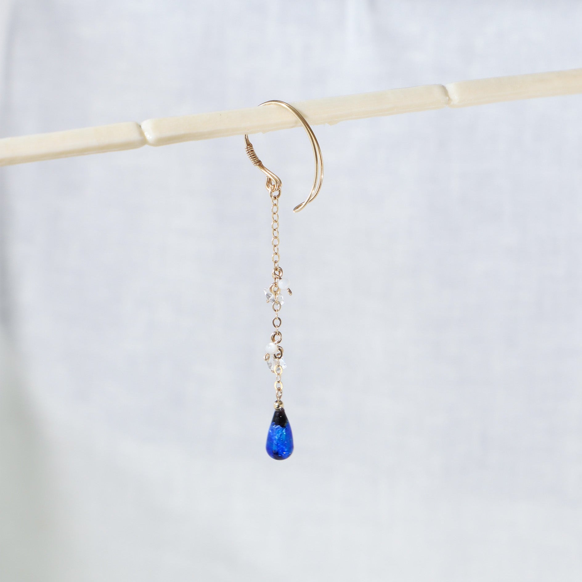 しずくタイプのホタルガラスに、シェルとハーキマークリスタルを合わせたロングチェーンイヤーカフ。