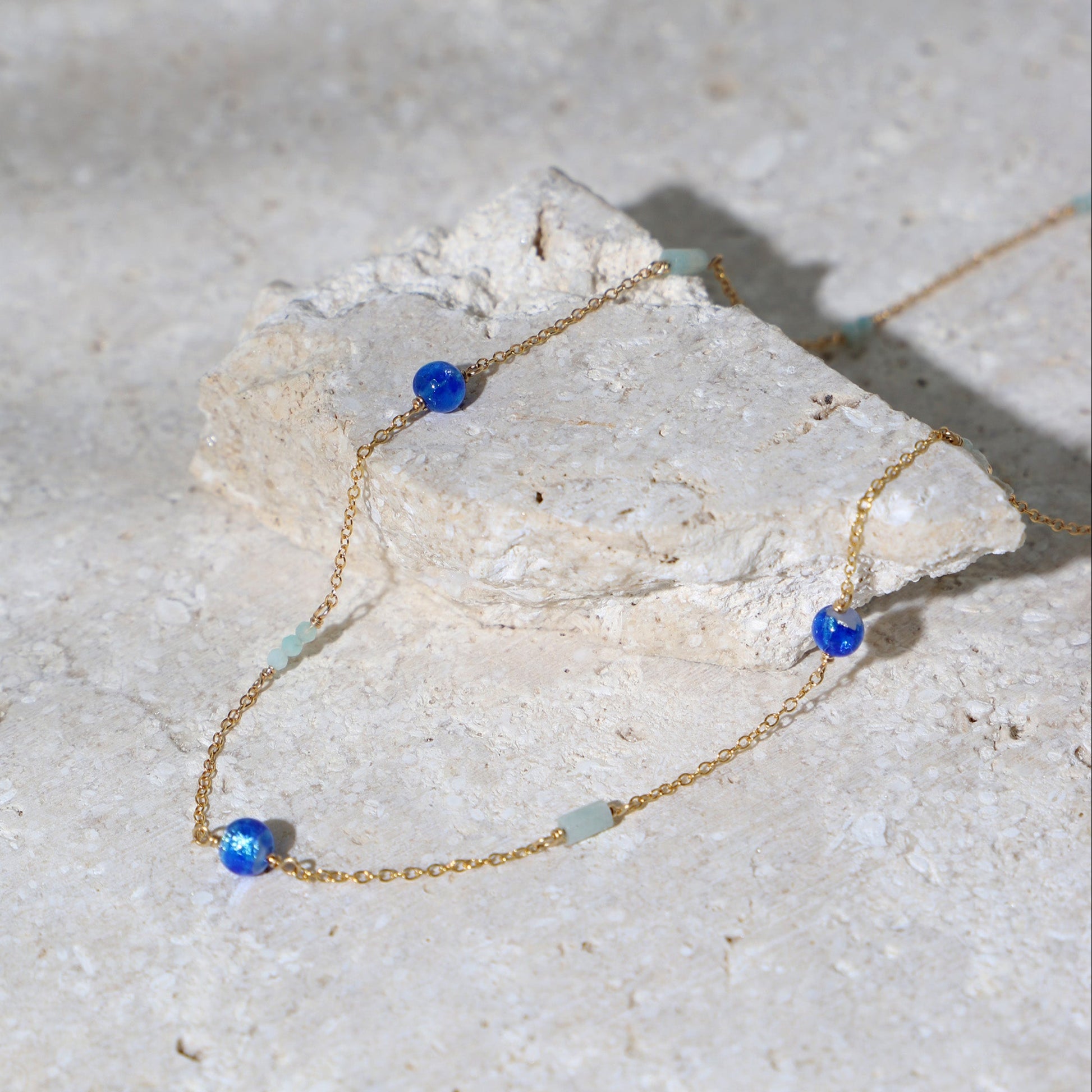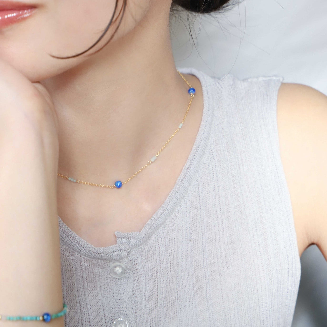 ホワイトホタルガラスとアマゾナイトを組み合わせた涼しげな印象のネックレス。