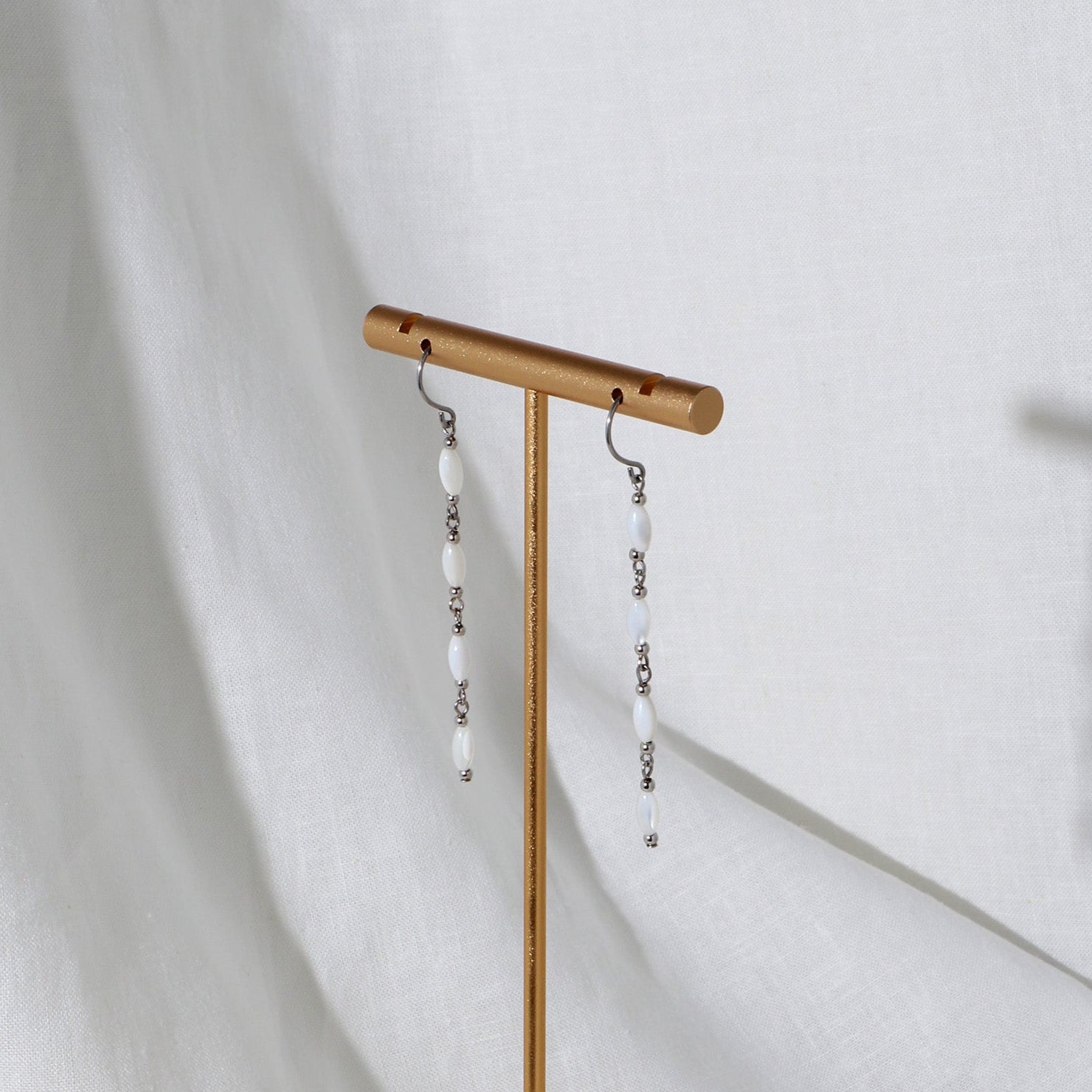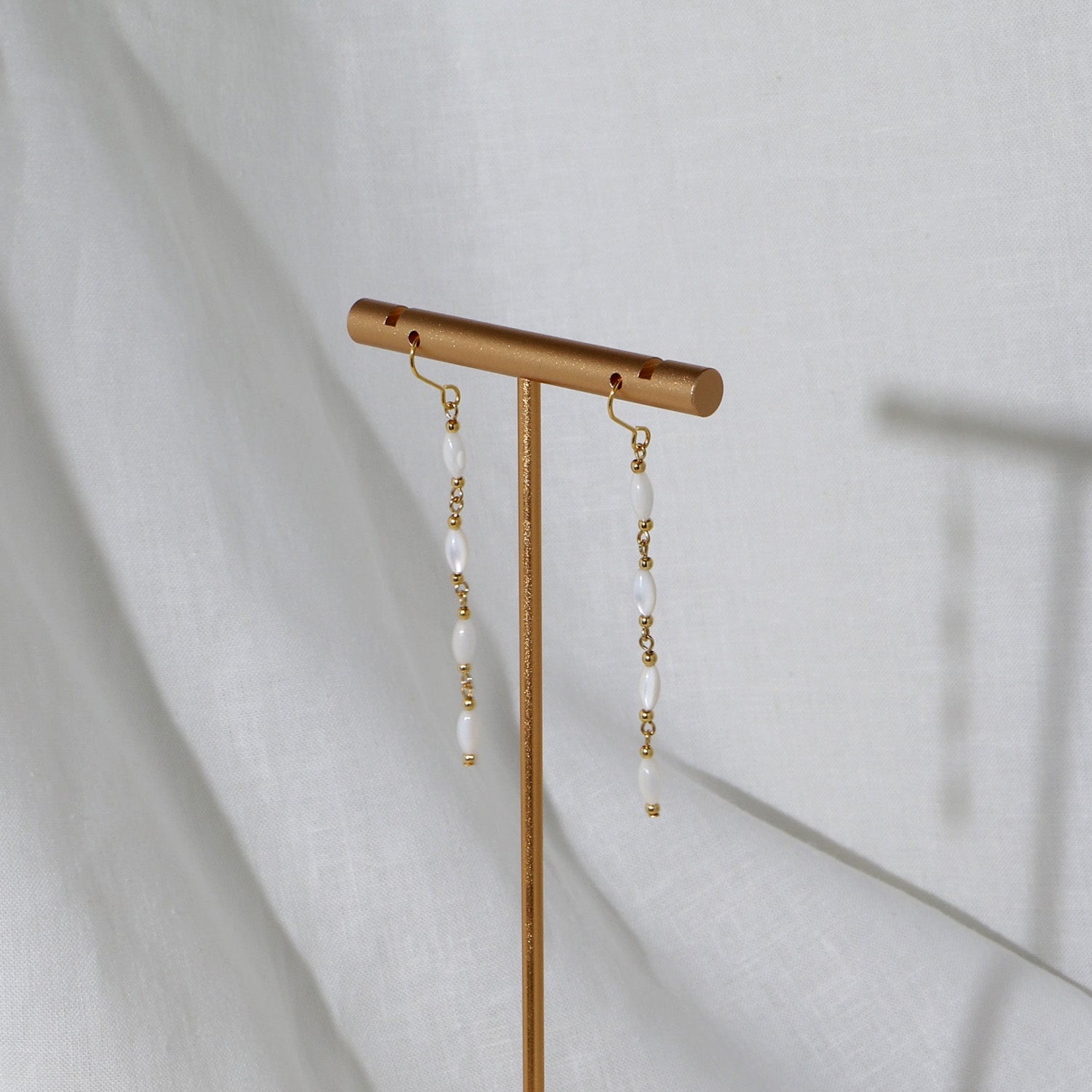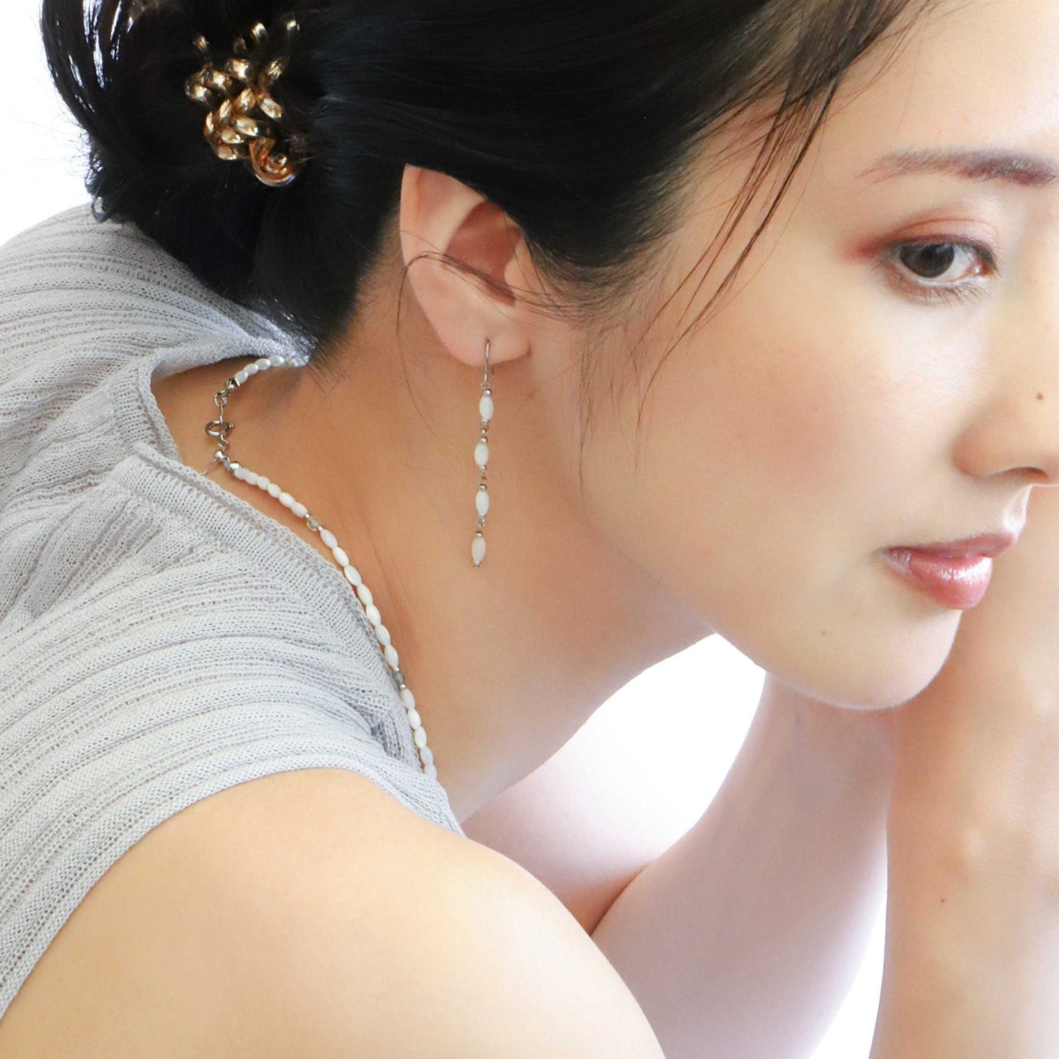 上質な輝きを放つマザーオブパールを3粒連ね、繊細ながらも存在感を放つデザイン。