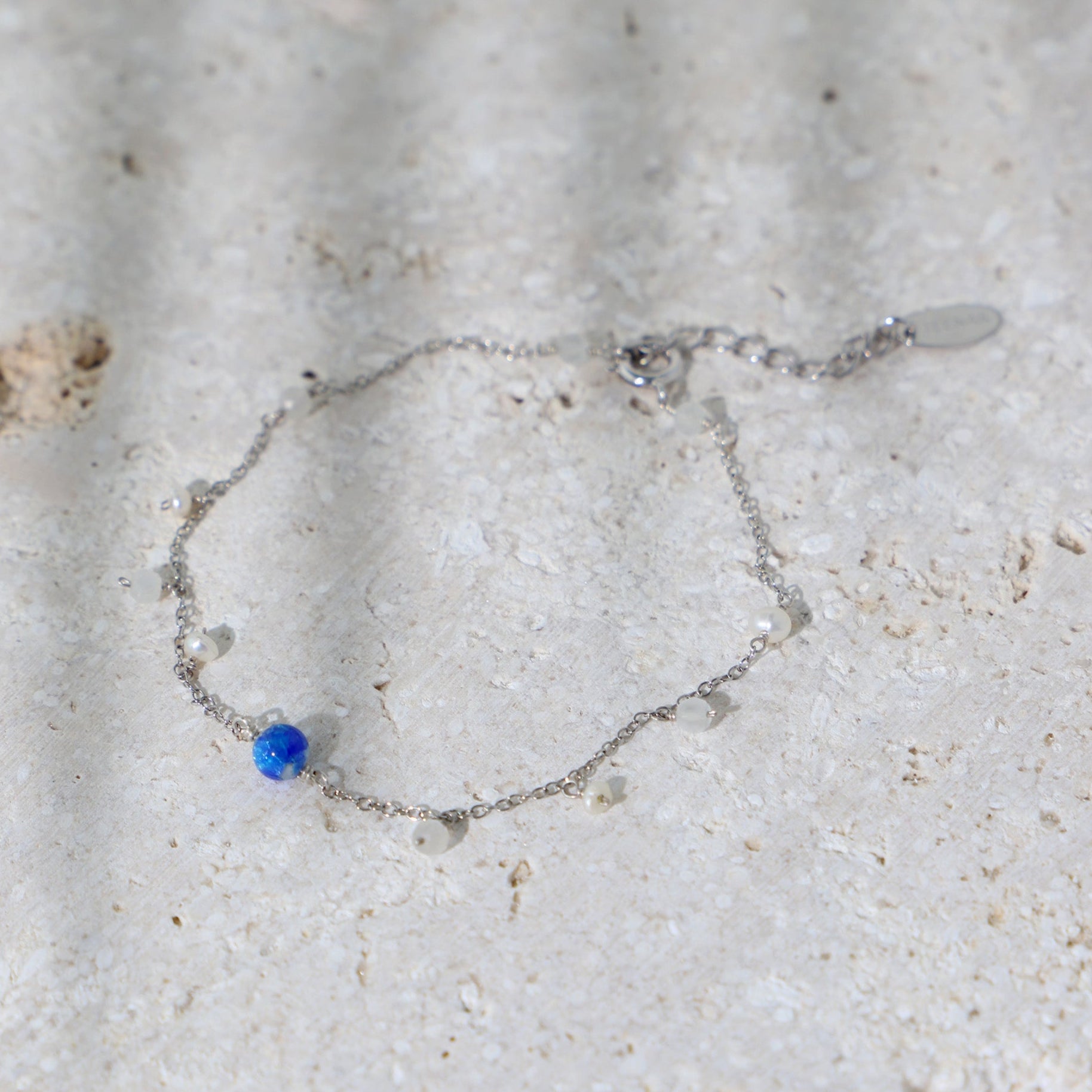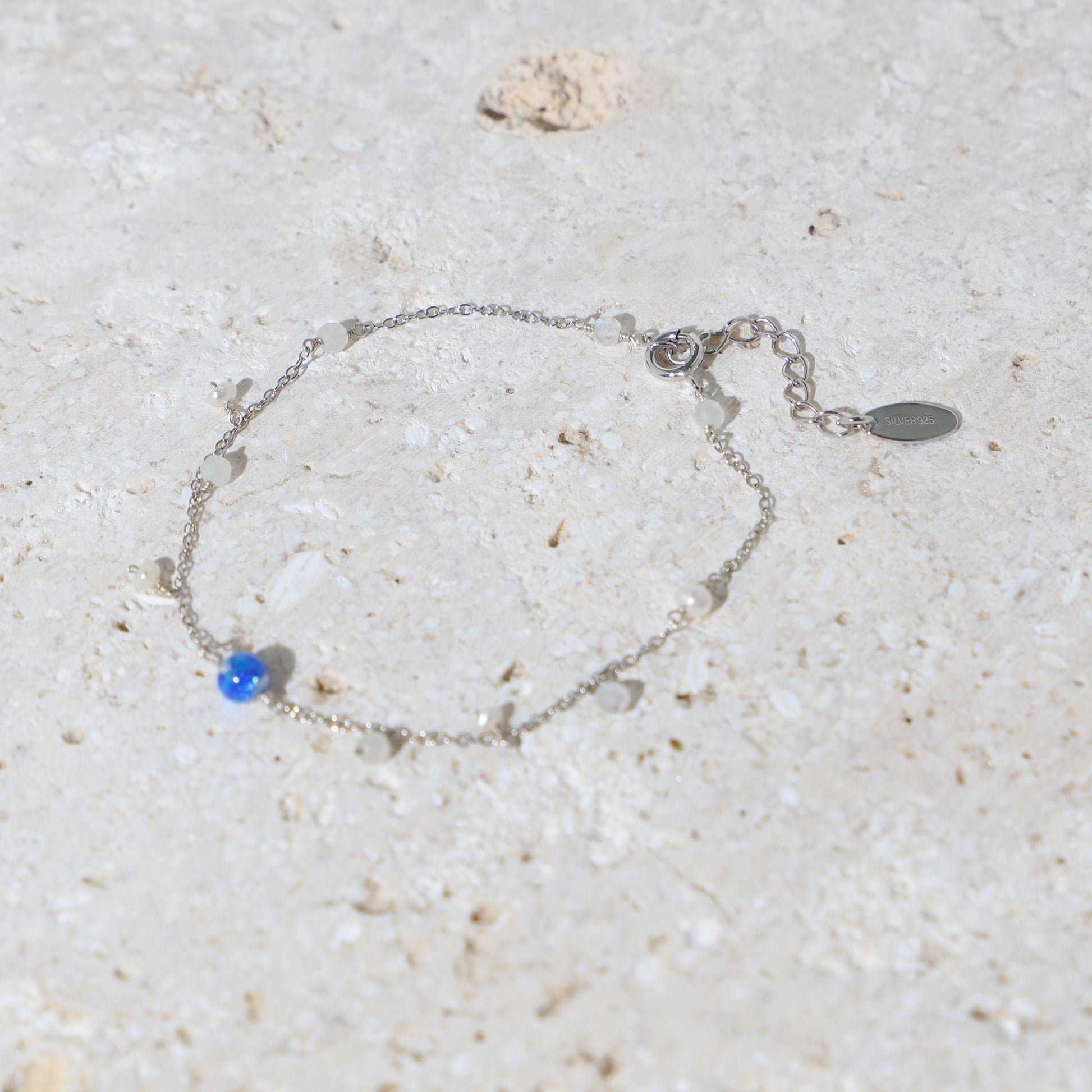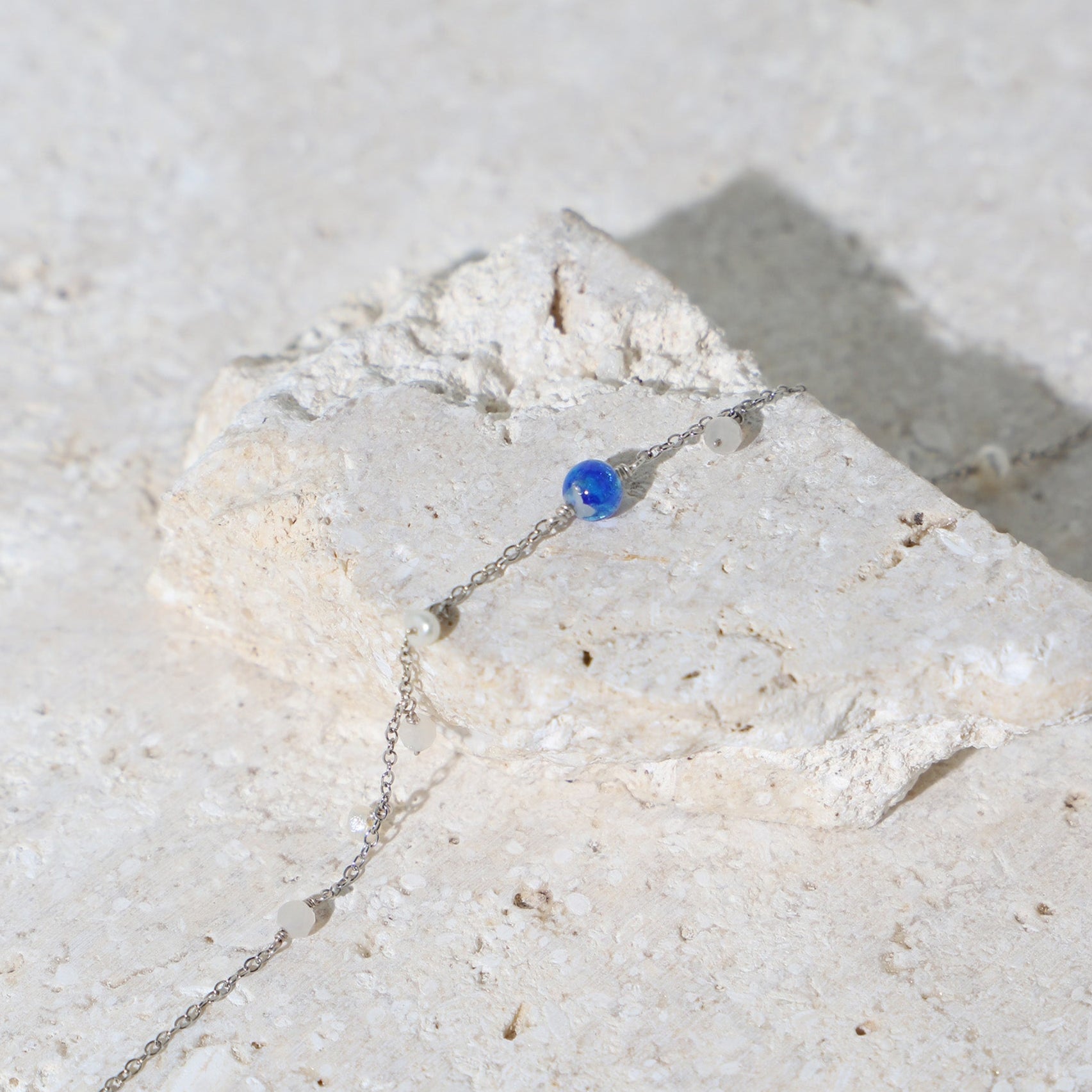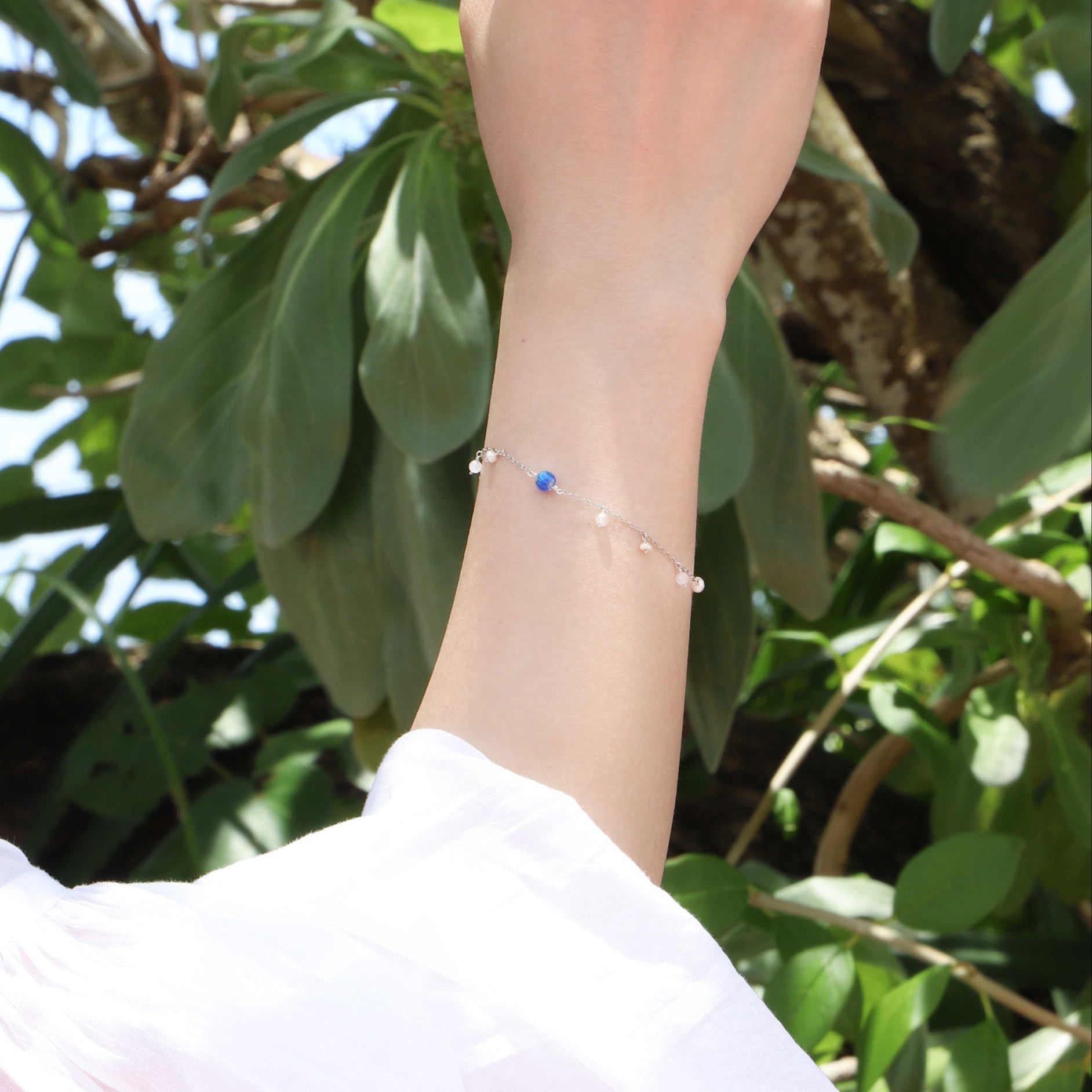 淡水パールとムーンストーンの優しい輝きに、ホタルガラスの幻想的な色合いを組み合わせたブレスレット。