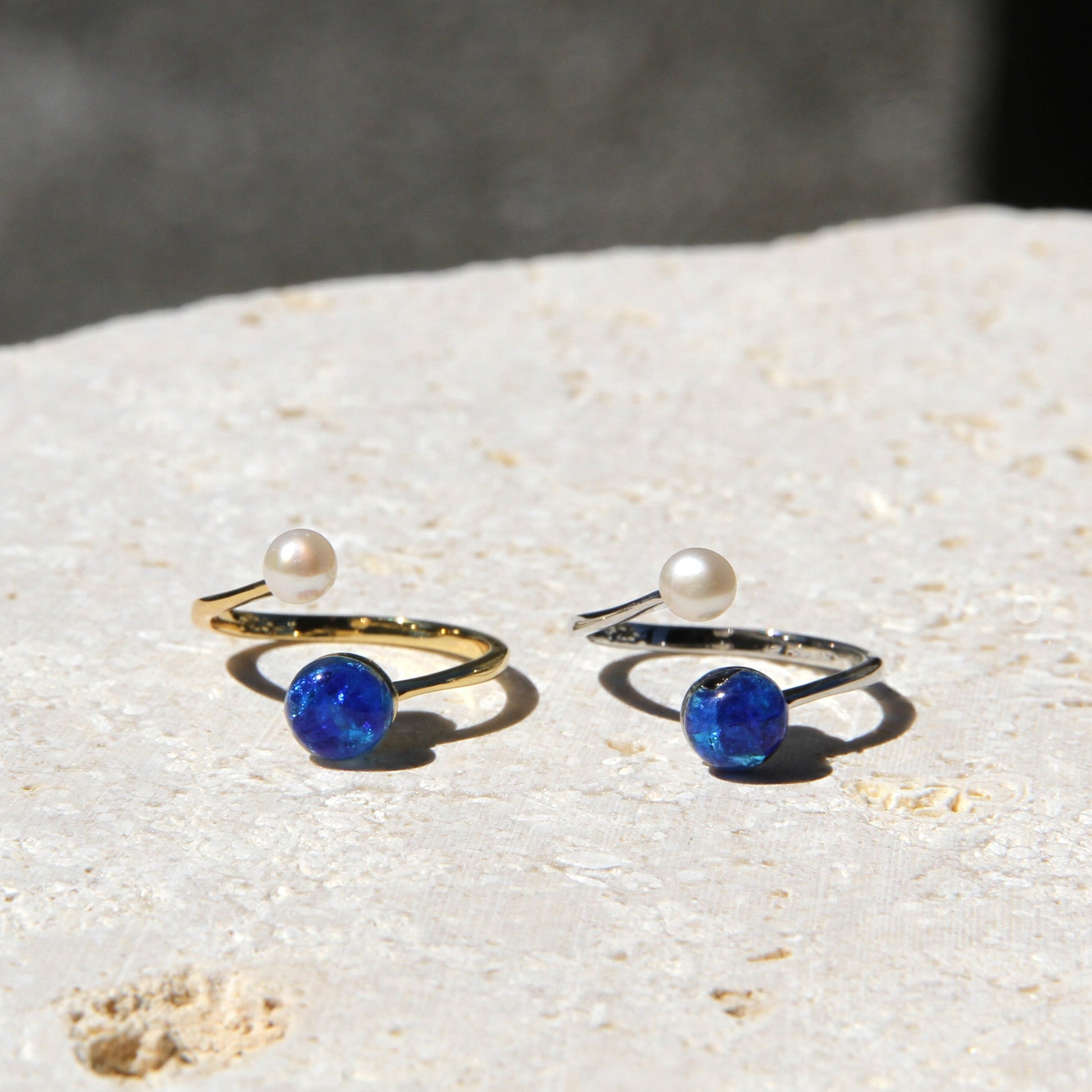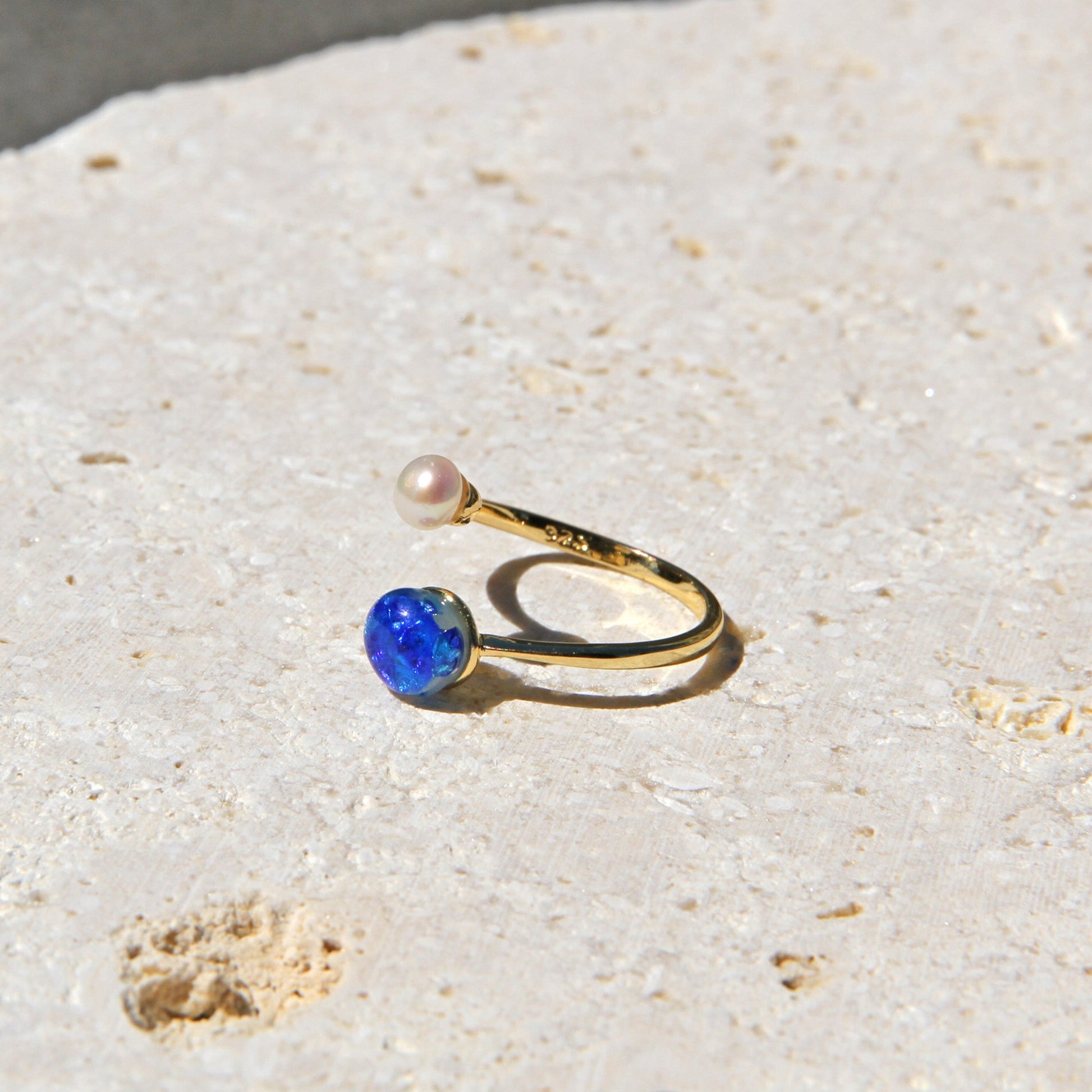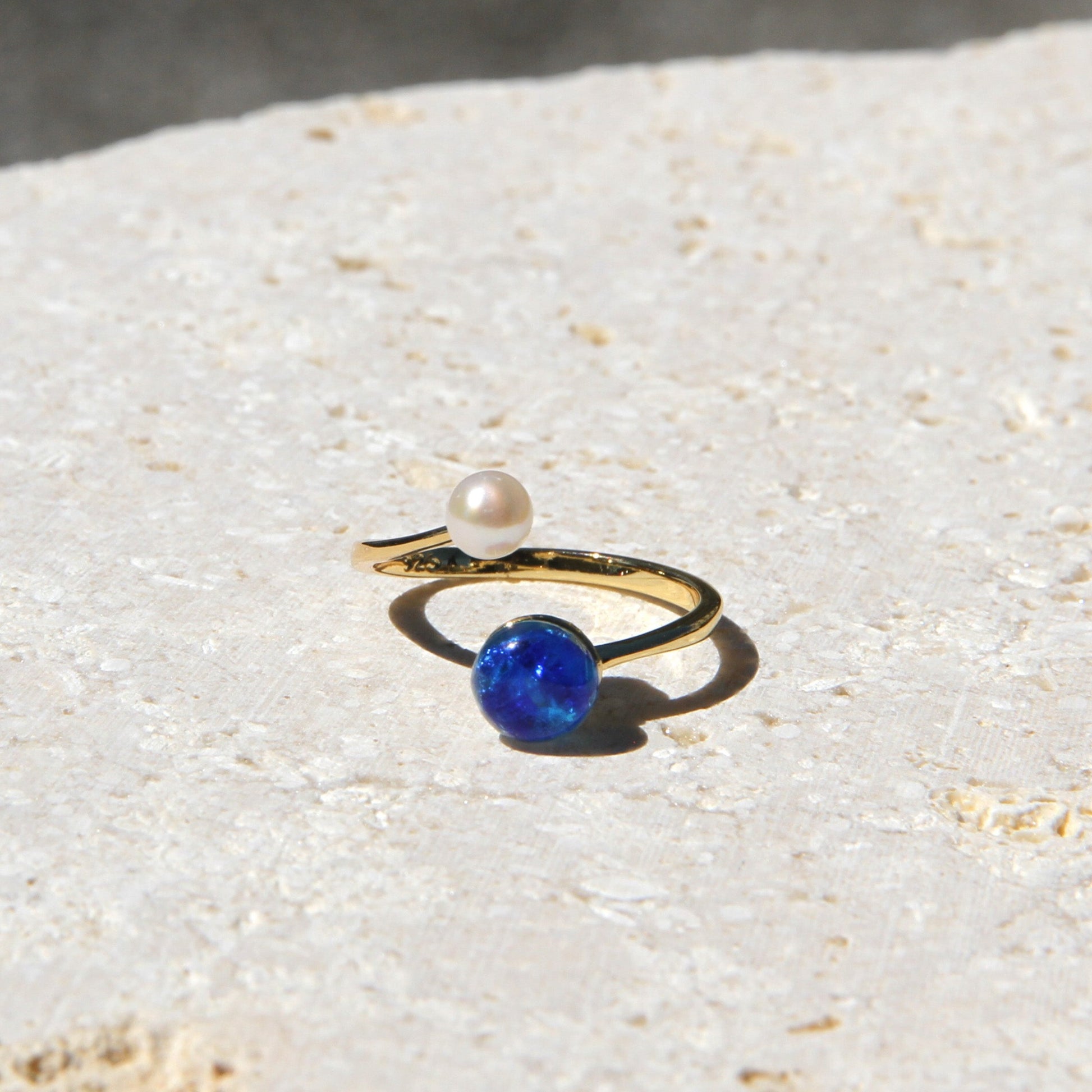 デイリーにも取り入れやすい淡水パールとホタルガラスを組み合わせたツイストリング。フリーサイズ仕様のため、気分によって装着を切り替えられます。