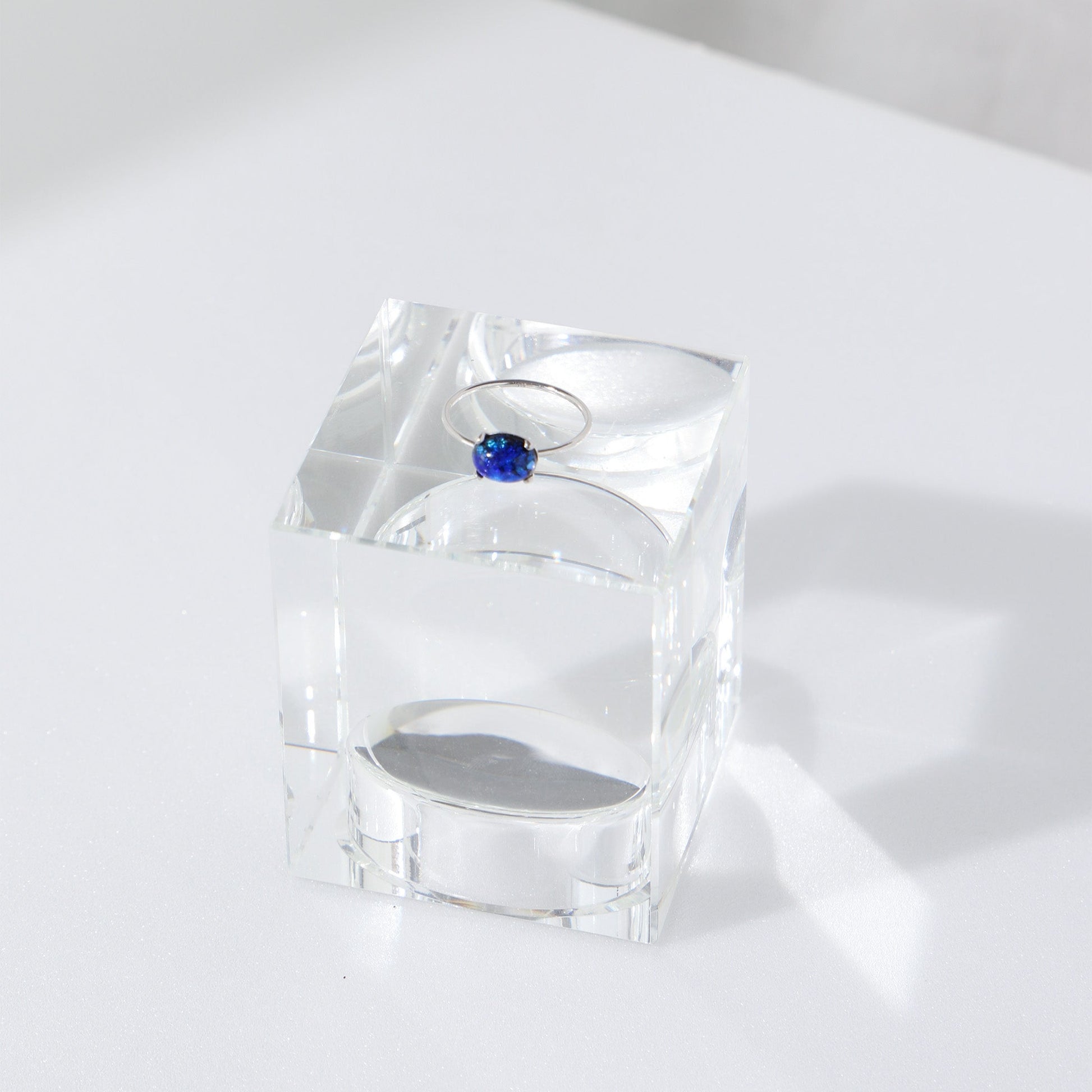 丸みのあるフォルムが手元に柔らかな印象を与え、光を受けるたびに奥行きのあるホタルガラスが幻想的な輝きを放ちます。