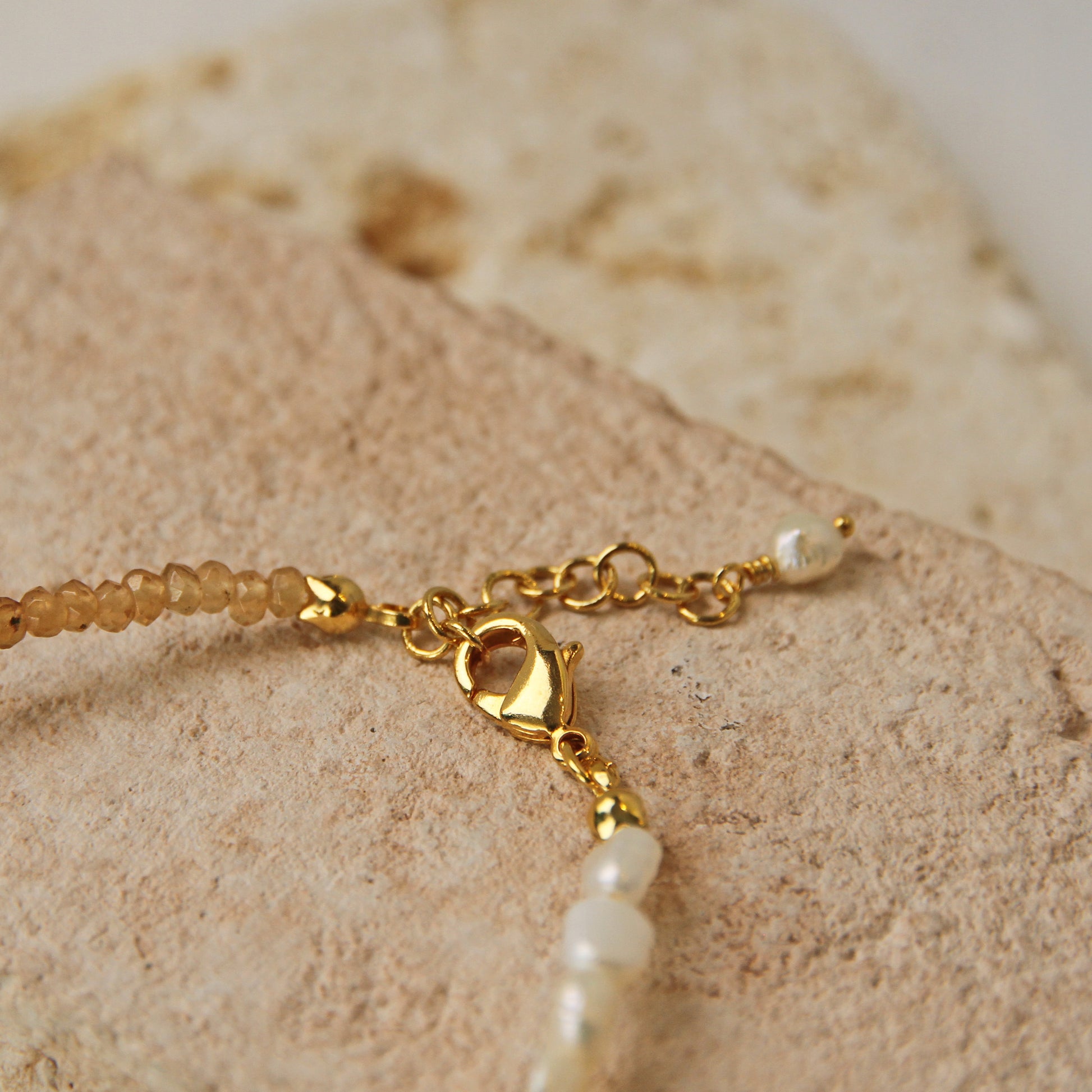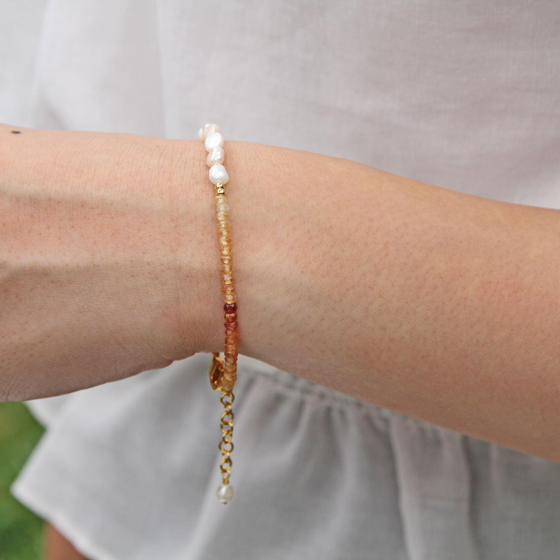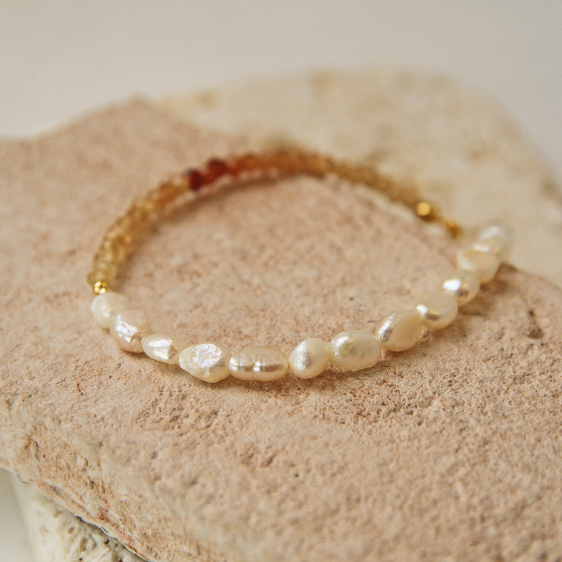 오렌지 가넷과 민물 진주를 결합한 팔찌. 캐주얼에도 포멀에도 다양한 장면에서 활약 해주는 아이템입니다.