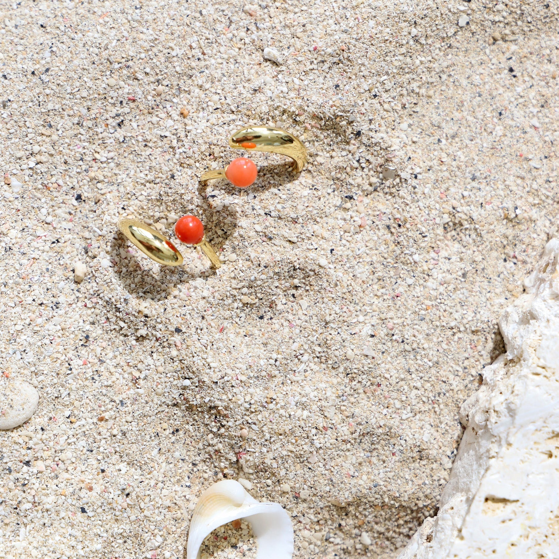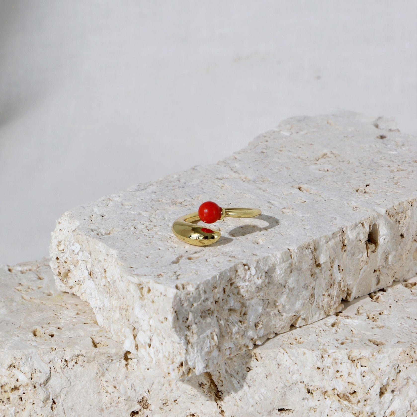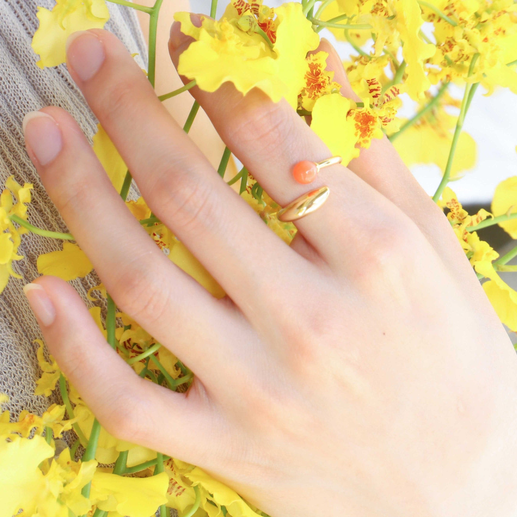 オープンタイプで先端に一粒の珊瑚をあしらったリング。