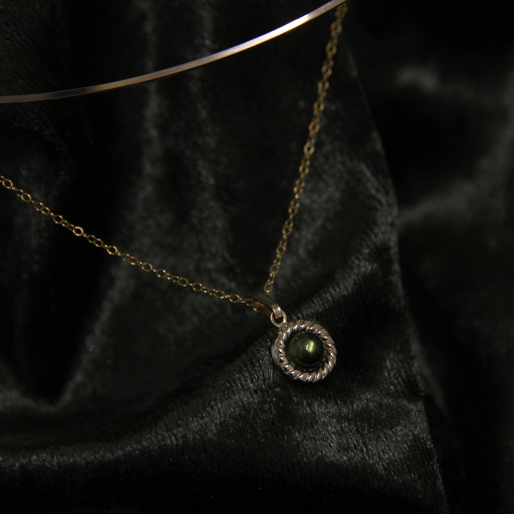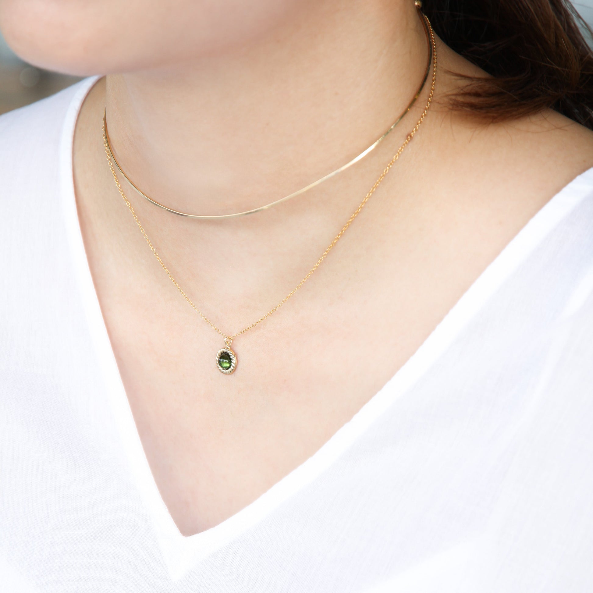 深みのあるグリーントルマリンの柔らかな輝きが胸元を上品に彩ってくれるアイテム。