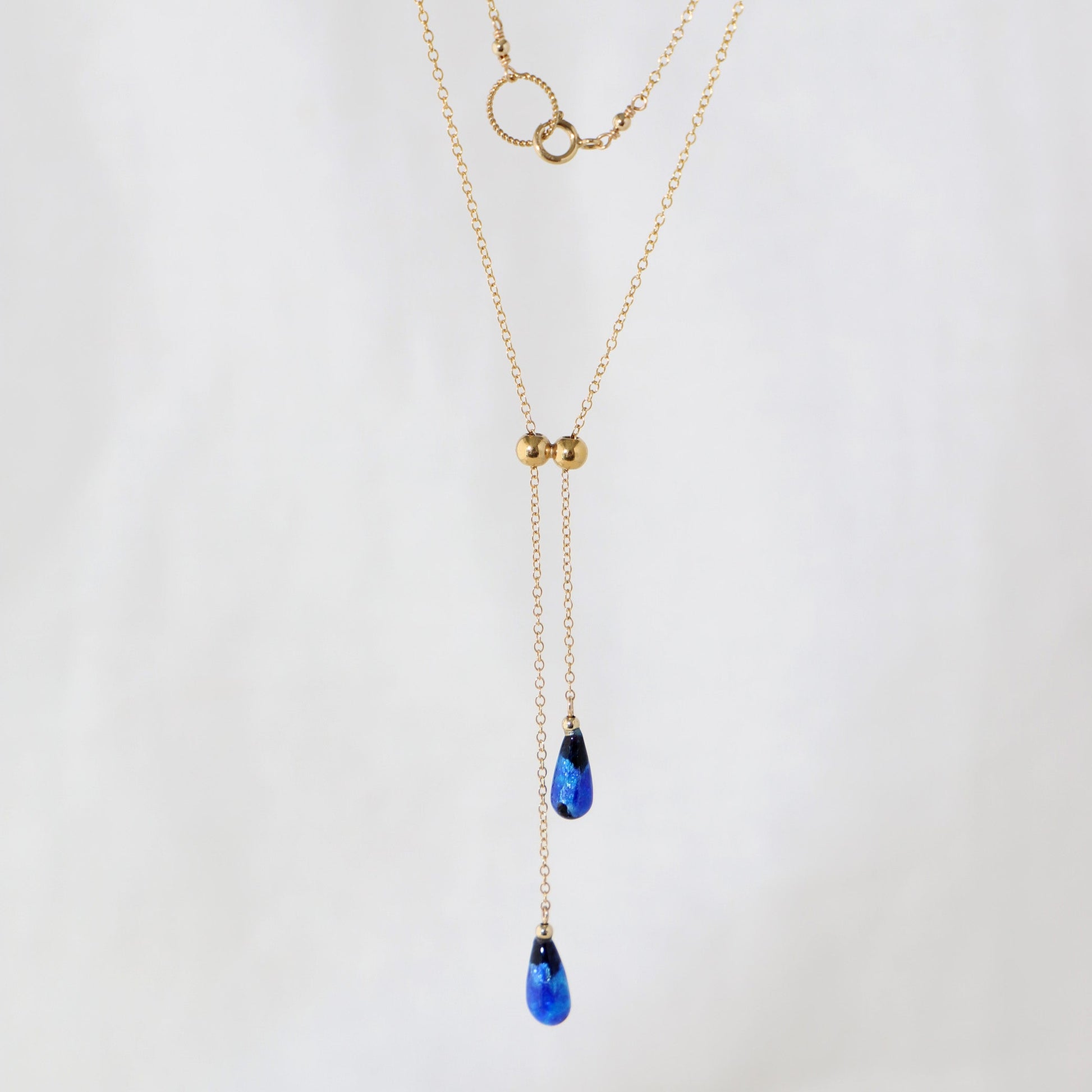 海のきらめきを閉じ込めたような、しずくタイプのホタルガラスを使用したロングネックレス。