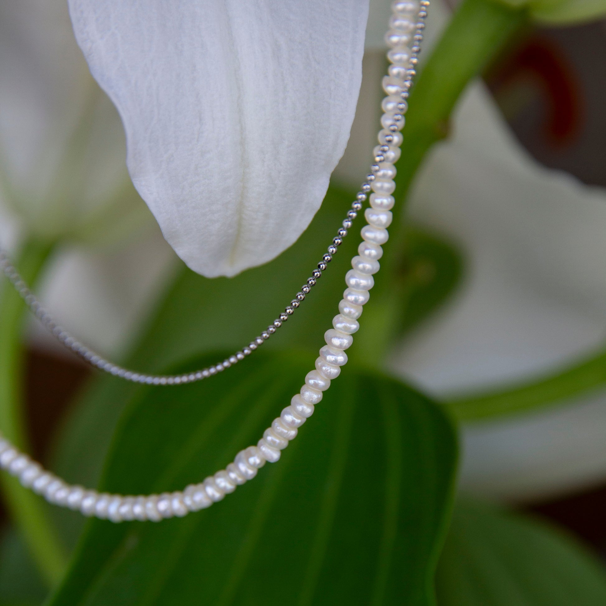 淡水パールとミニマムサイズのボールチェーンが融合したモダンなデザイン。Tシャツなどラフスタイルとの相性が良く、何気ない日にもこなれ感をプラス。