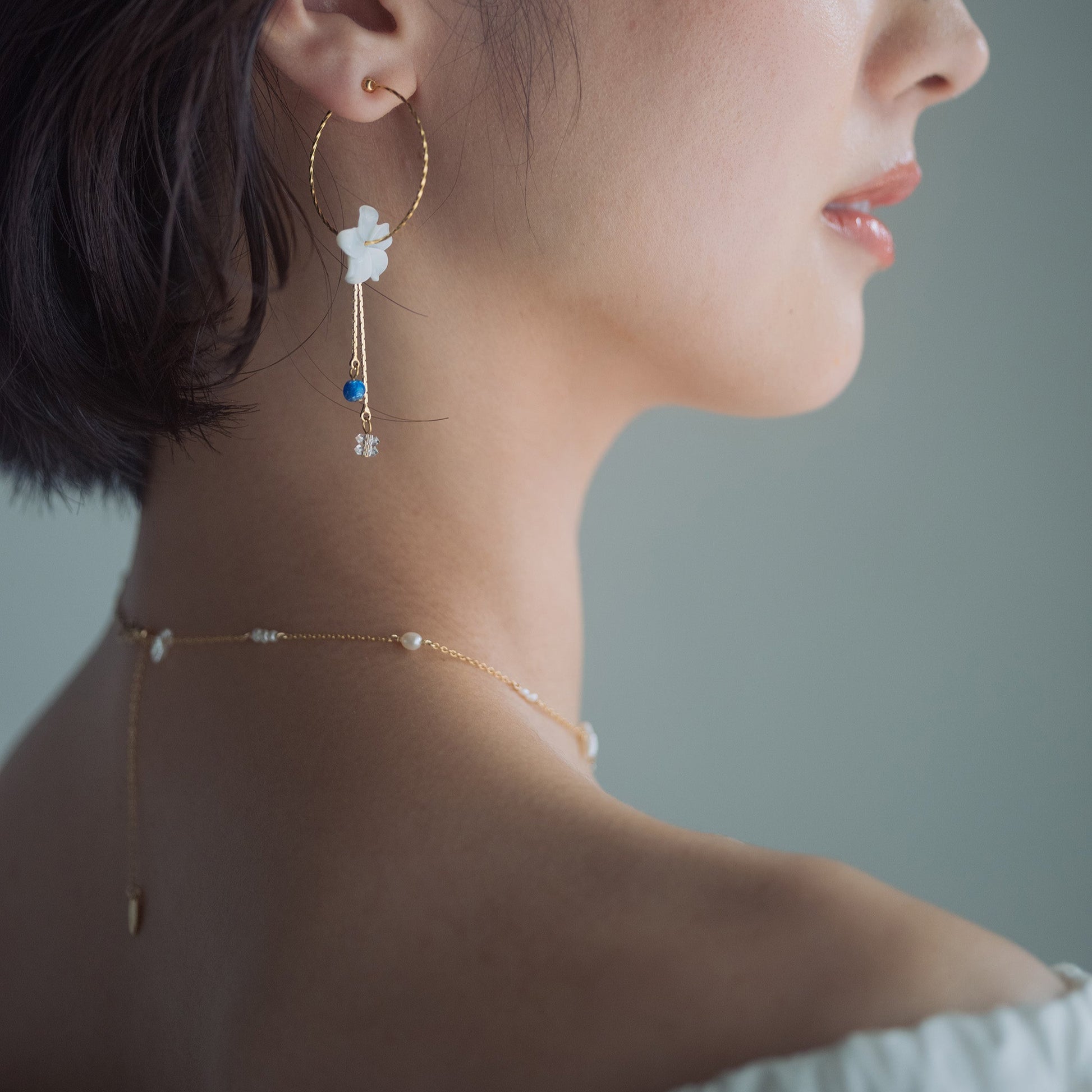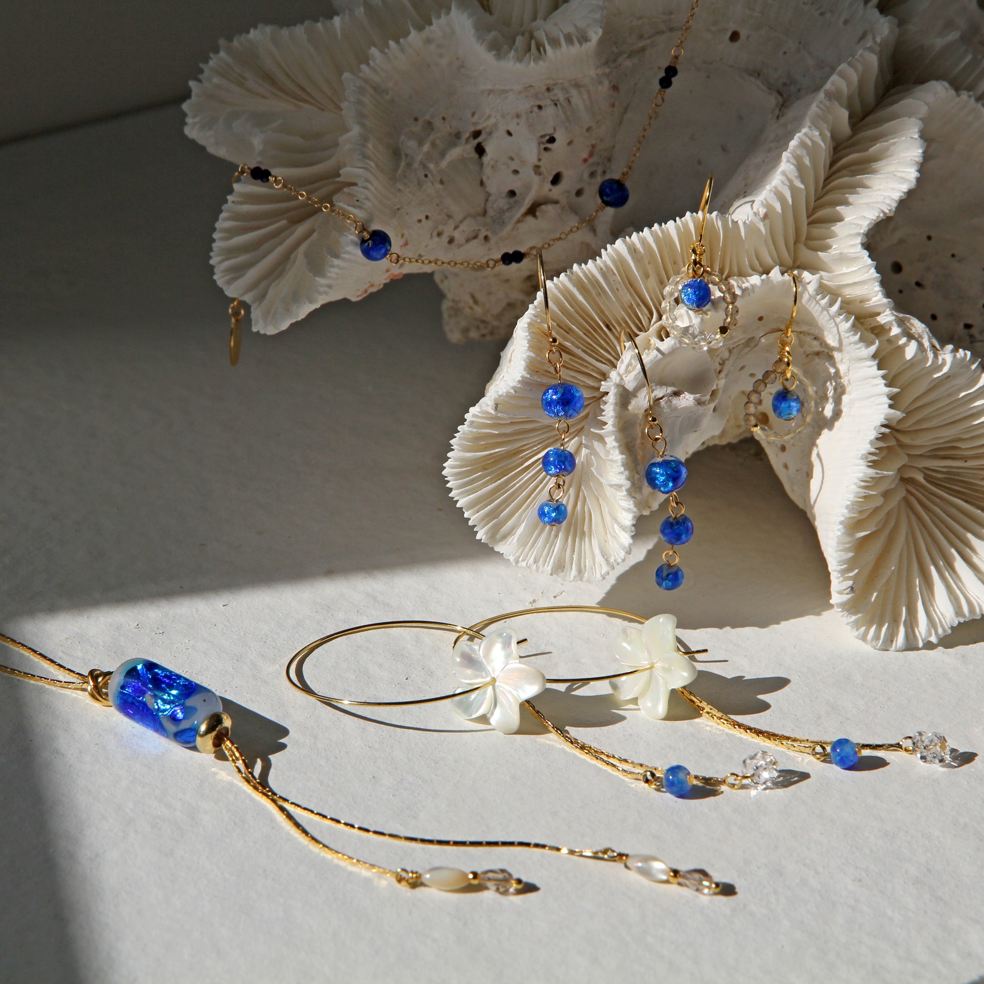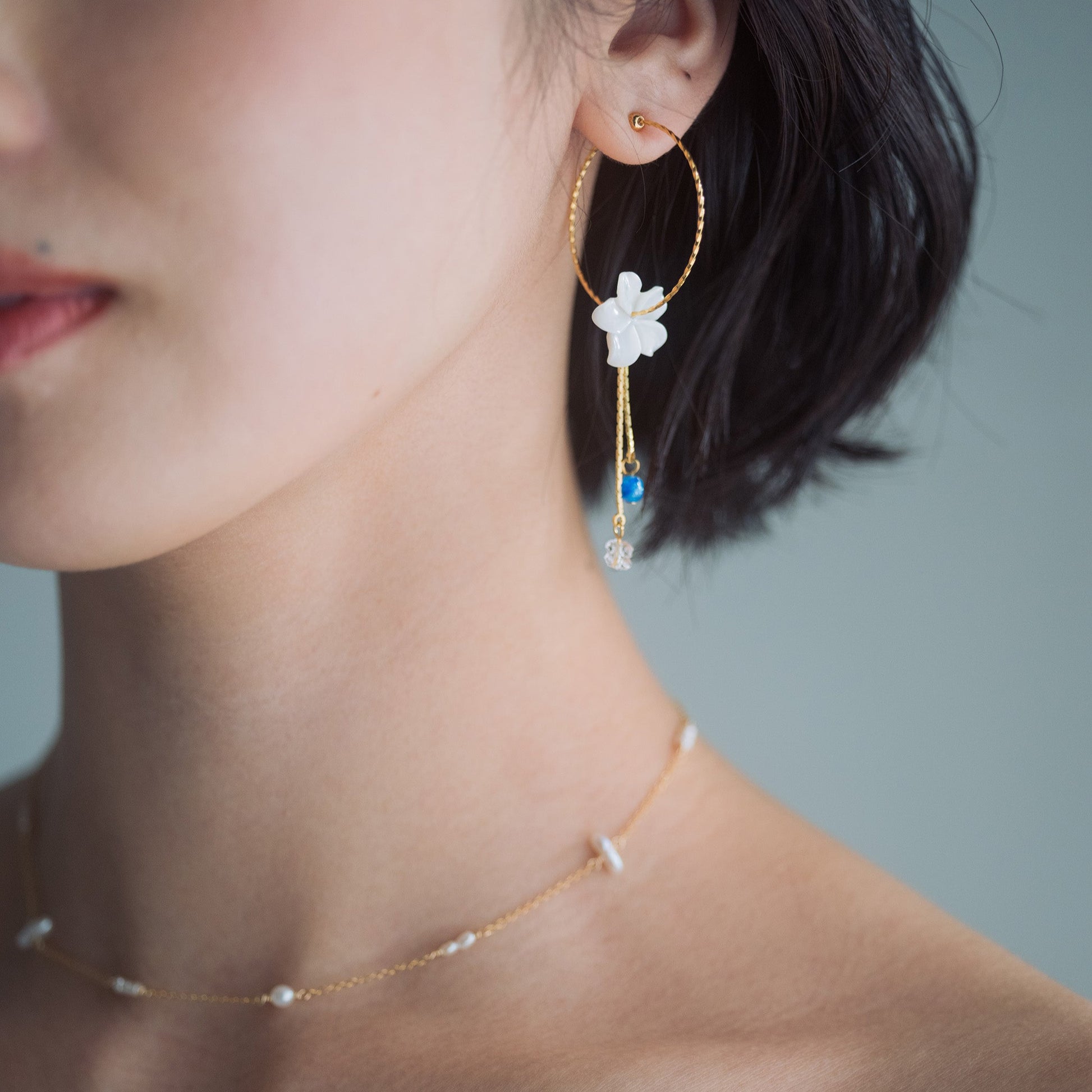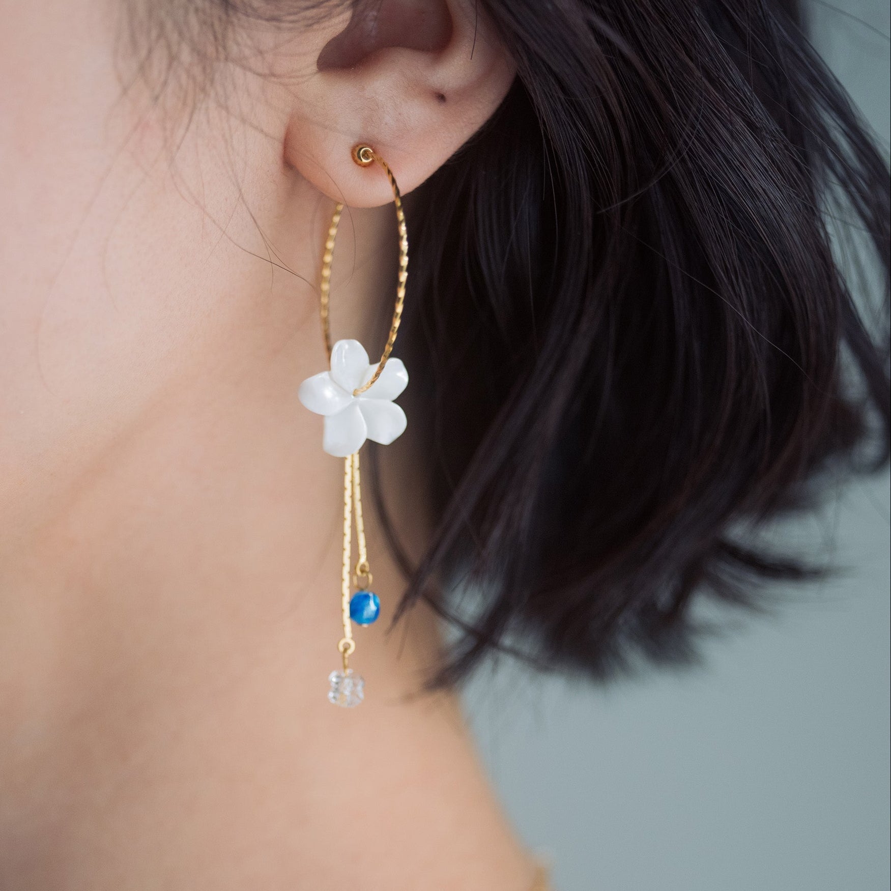 プルメリア型のシェルとホワイトホタルガラス、水晶が揺れるフープピアス。ホワイトホタルガラスと水晶が爽やかでリゾート感溢れる印象に。旅行のお土産としてもたいへん人気の高いアイテムです。イヤリングもお選び頂けます。